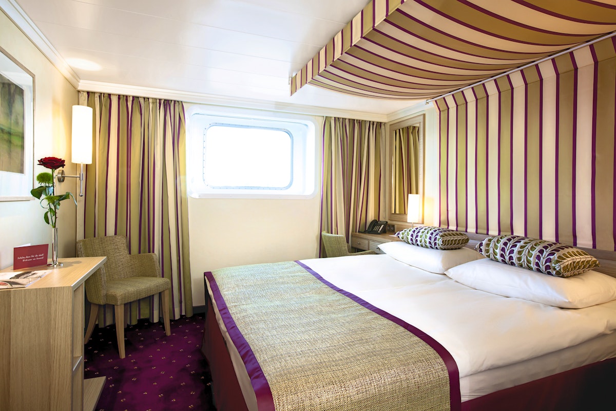 Die 14,5 Quadratmeter großen Kabinen verfügen über 2 Betten, Dusche/WC, Föhn, TV (eingeschränkter Empfang), Safe und Klimaanlage. Die Fenster können nur auf Deck 2 und 3 geöffnet werden (französischer Balkon).