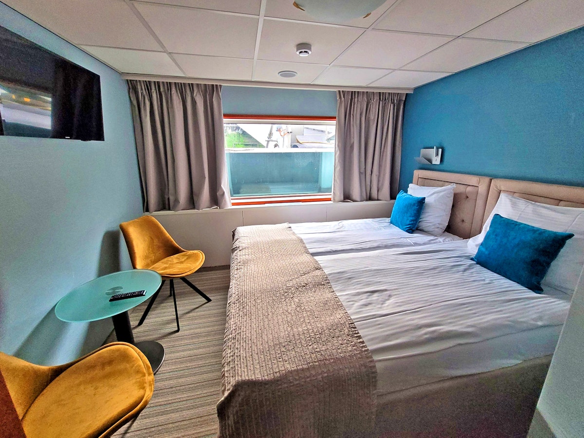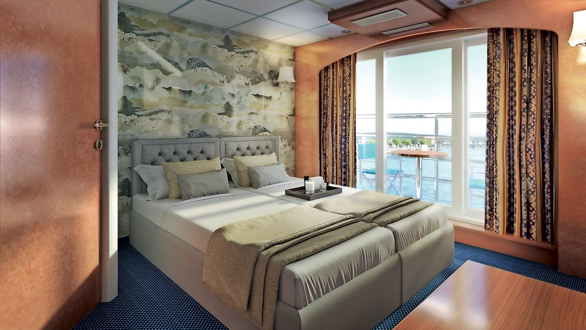 Alle Kabinen sind Außenkabinen, ca. 15 Quadratmeter groß und mit Dusche, WC, Föhn, Safe, Telefon sowie HD-TV ausgestattet. Die Kabinen auf dem Hauptdeck sind mit oberen schmalen Panoramafenstern, welche nicht zu Öffnen sind, ausgestattet. Über Treppen erreichen Sie das Mitteldeck.