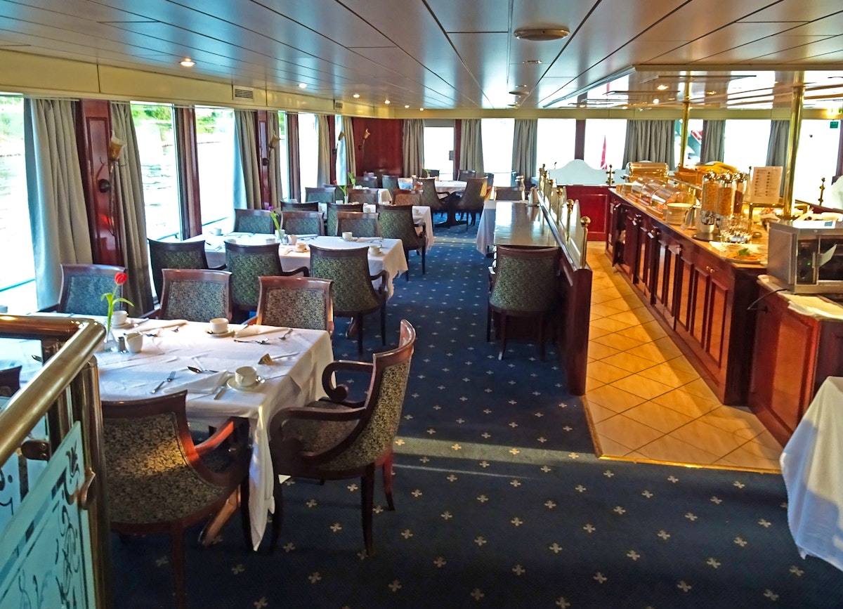 Im Panorama-Restaurant werden Sie mit reichhaltigen Speisen bedient. Die Kaffee-/Tee-Station steht auf dem Oberdeck zur Verfügung.