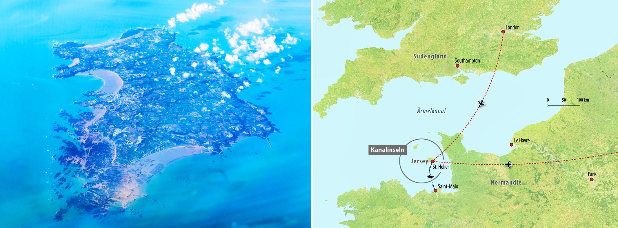 Jersey von oben und die Lage im Ärmelkanal zwischen der Normandie und Südengland