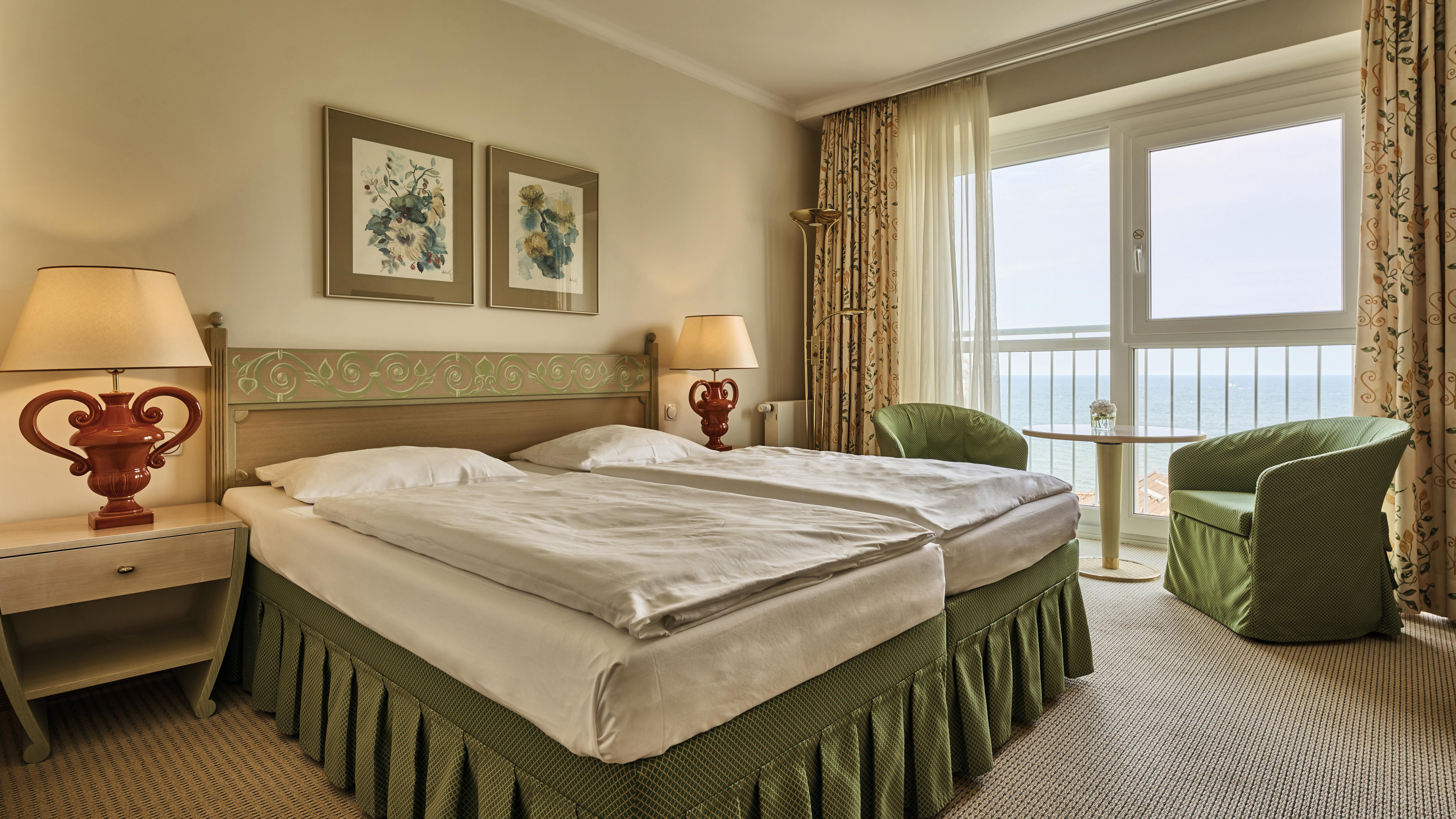 Die Doppelzimmer zur Landseite (DIX - mit Balkon DBC) sind ca. 18 - 32 Quadratmeter groß und befinden sich im Haupthaus oder in den Villen. Sie sind stilvoll und komfortabel ausgestattet mit Bad oder Dusche/WC, LCD TV, Tablet (digitale Gästemappe), Sitzgelegenheit, Minibar und Safe.