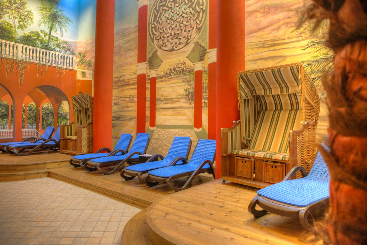 Die orientalische Wellness-Oase verteilt sich auf 1.200 Quadratmeter und verfügt unter anderem über ein Schwimmbad (9 x 15 Meter), Whirlpoolbänke mit Unterwassermusik, Kinderbecken mit Wasserfall, Amethystensauna, Eisgrotte, Erlebnisduschen und ein Solarium.