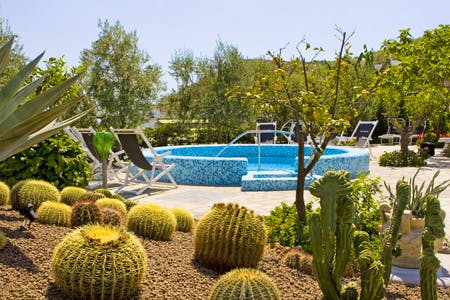 Auf dem Gelände des Hauses befinden sich drei Außenpools, jeweils mit Unterwassermassage. Die Pools haben unterschiedliche Temperaturen - der größte von Ihnen hat ca. 34°C warmes Wasser, ein etwas kleineres sogar 38°C. Das dritte Becken ist ein Kinderbecken. Zudem finden Sie einen kleinen römischen Wasserfall an einem Becken.