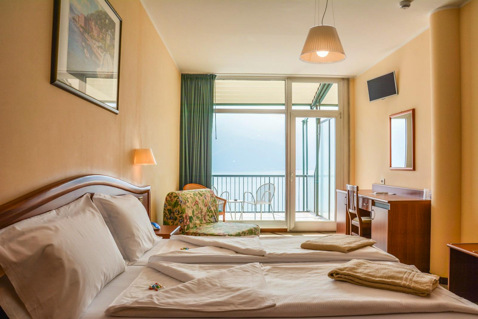 Die Zimmer sind mit Dusche/WC, Föhn, Telefon, Sat-TV, Weckanlage, Klimaanlage, Kühlschrank, Safe und Balkon/Terrasse zur Seeseite ausgestattet.