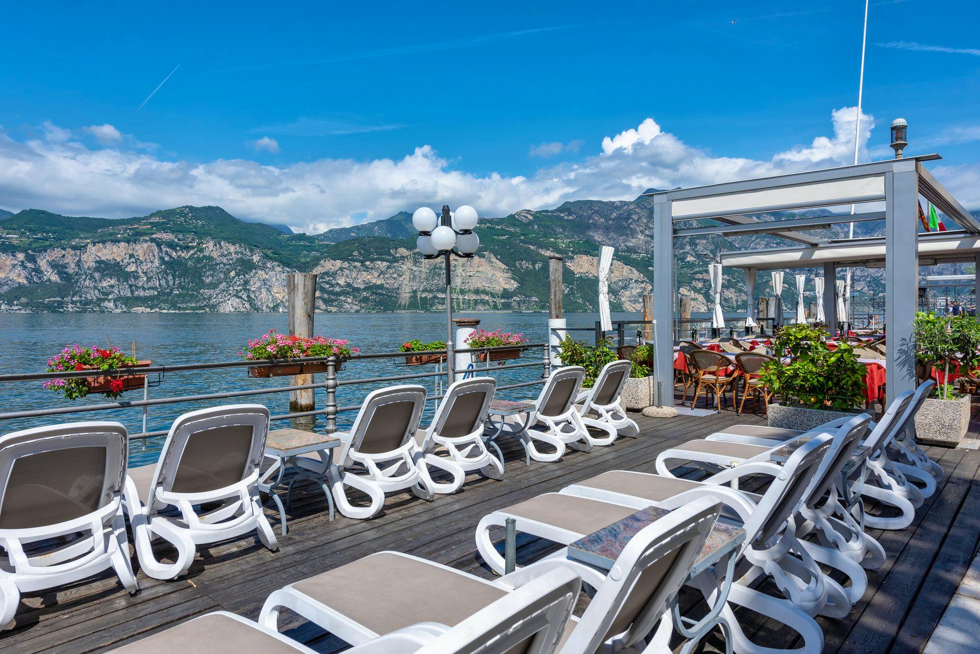 Zur Hotelausstattung gehören eine Bar, ein Restaurant mit traumhaften Blick auf den Gardasee und eine Terrasse mit Liegen und Sonnenschirmen.