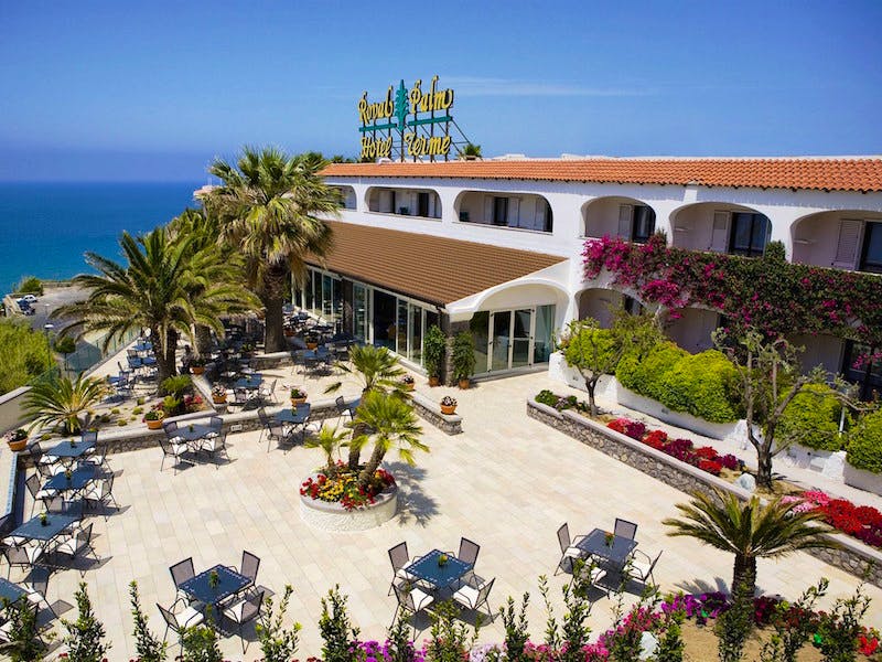 Das 4-Sterne Hotel Royal Palm Terme befindet sich ca. 1,5 Kilometer vom Zentrum Forios sowie 2 Gehminuten vom Strand entfernt. Nach einem ca. 25-minütigen Spaziergang entlang der Küste erreichen Sie das Stadtzentrum. 200 Meter vom Hotel entfernt, befindet sich außerdem eine Bushaltestelle, von wo Sie ebenfalls das Zentrum mit dem örtlichen Bus erreichen können. Das Haupthaus in Form einer Schiffsspitze erstreckt sich auf der linken Seite zur faszinierenden Citara-Bucht mit dem malerischen Strand sowie den größten Thermalgärten Europas, den Poseidon-Gärten.