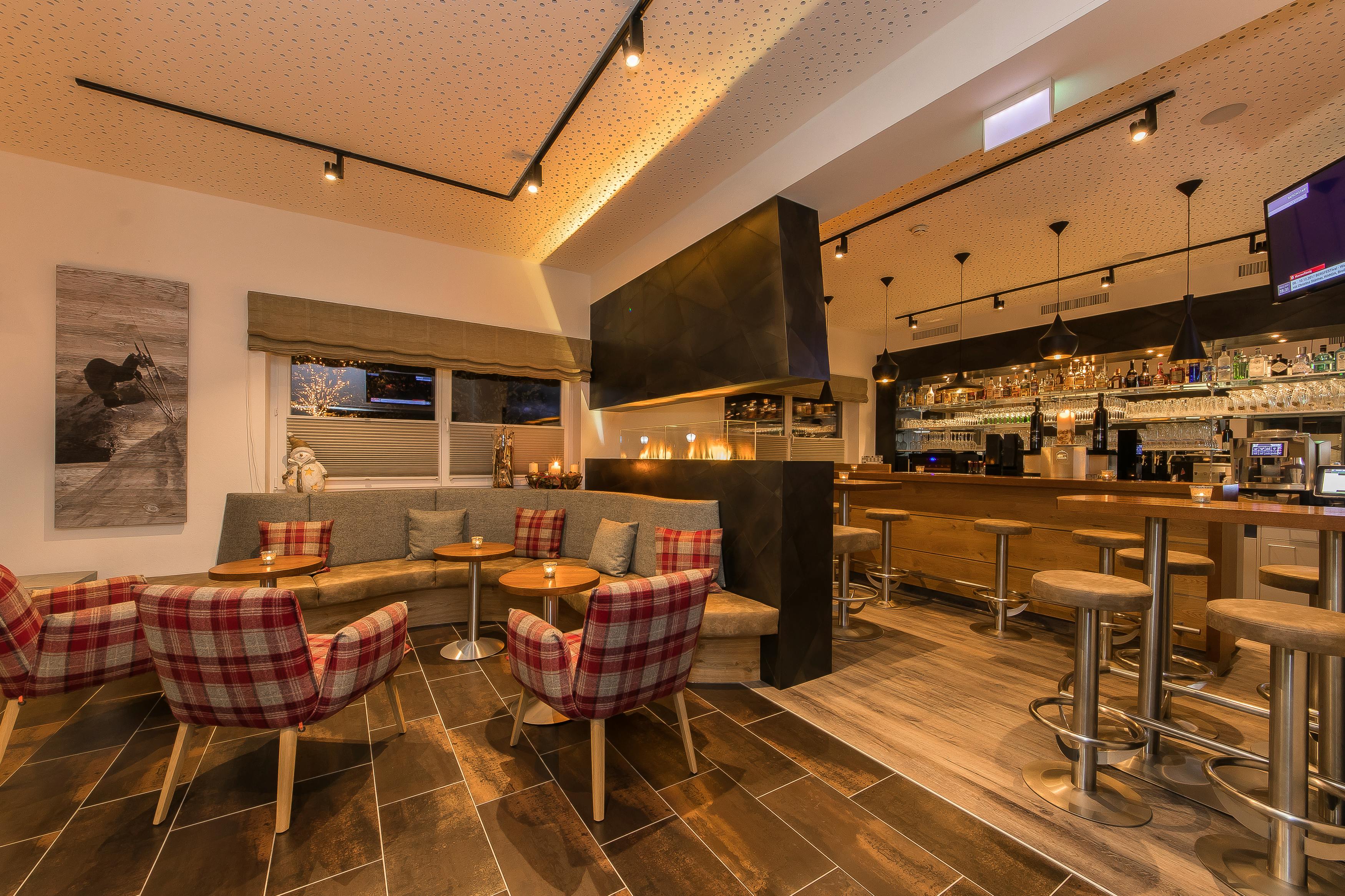 Wellness-Bereich im Hotel Almrausch  – © © fullmarketing.at. GmbH Außenansicht Winter Hotel Almrausch in Hinterglemm – © PriTours Bar im Hotel Almrausch  – © PriTours Spa-Bereich im Hotel Almrausch – © © fullmarketing.at. GmbH Hotel Almrausch in Hinterglemm – © Hotel Almrausch in Hinterglemm