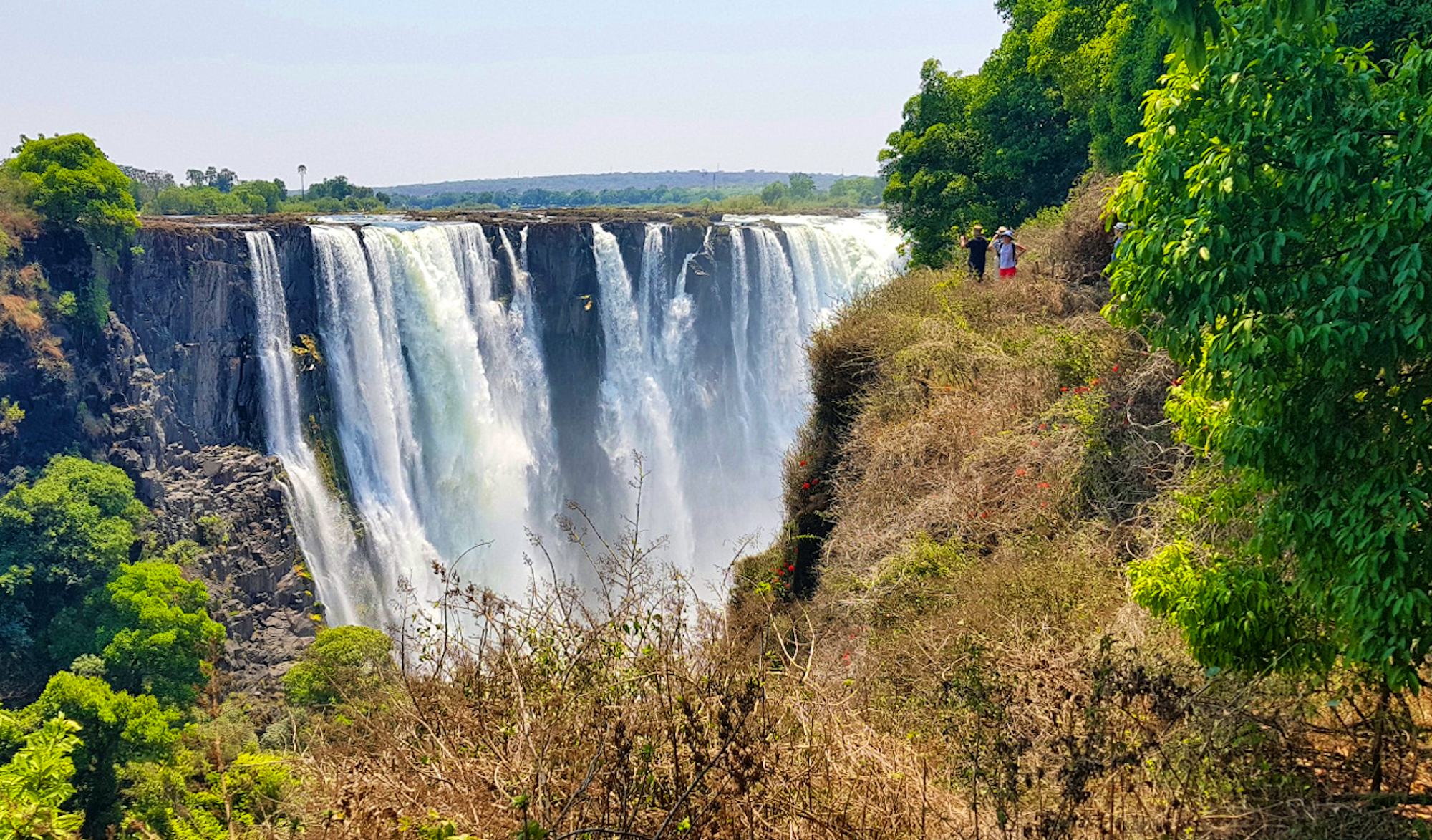 Heute besuchen Sie die Victoria Wasserfälle, die erst 1855 von dem Afrikaforscher David Livingstone entdeckt wurden und von ihm nach der damaligen englischen Königin benannt. Auf einer Breite von fast zwei Kilometern stürzt der Zambezi River 120 Meter in eine nur etwa 50 Meter breite Schlucht – ein beeindruckendes Natur-Schauspiel. Besonders am Ende der Regenzeit donnern gewaltige Wassermassen ohrenbetäubend über den Felsrand in die Tiefe und der entstehende Sprühnebel kann bis zu 400 Meter in die Höhe steigen. Er erzeugt in unmittelbarer Umgebung einen üppigen Urwald. Die Einheimischen nennen den Wasserfall Mosi-oa-Tunya – Rauch, der donnert. Auf einer kleinen Wanderung entlang der Wasserfälle bieten sich Ihnen spektakuläre Ausblicke.
