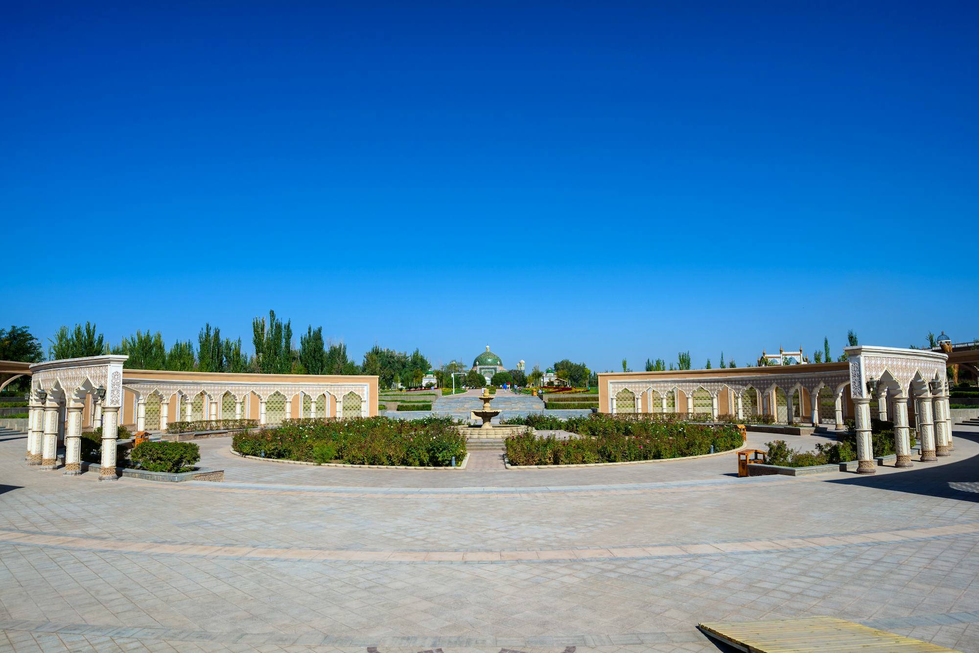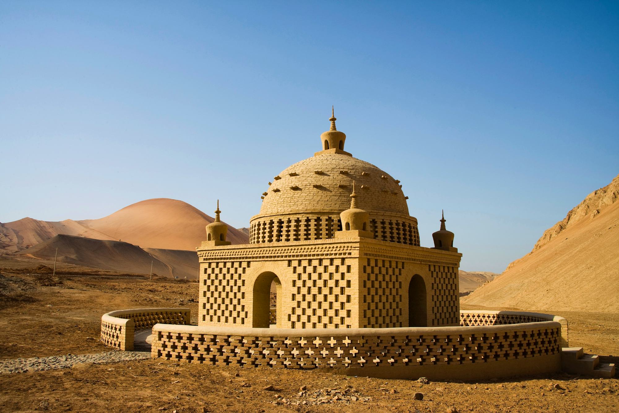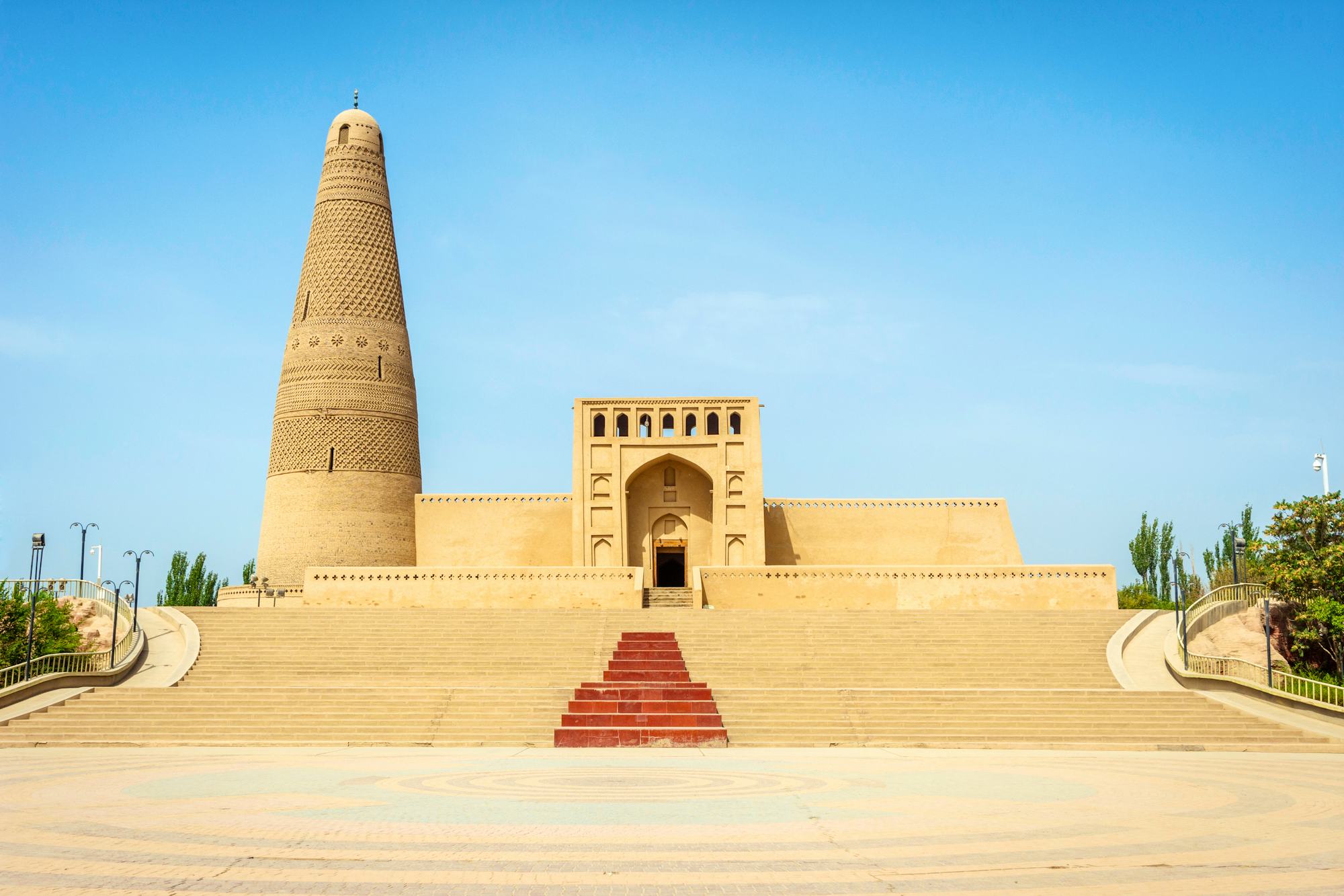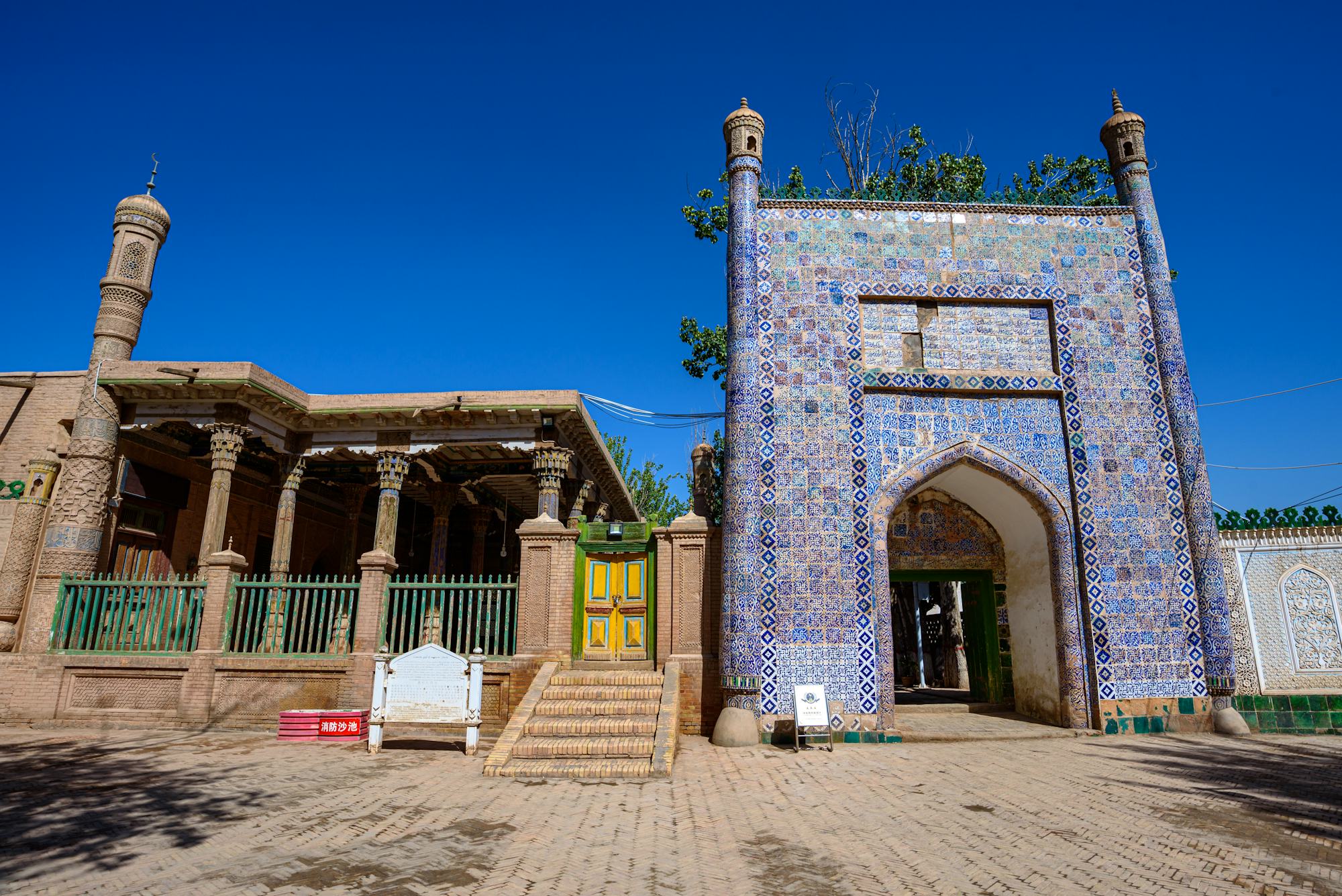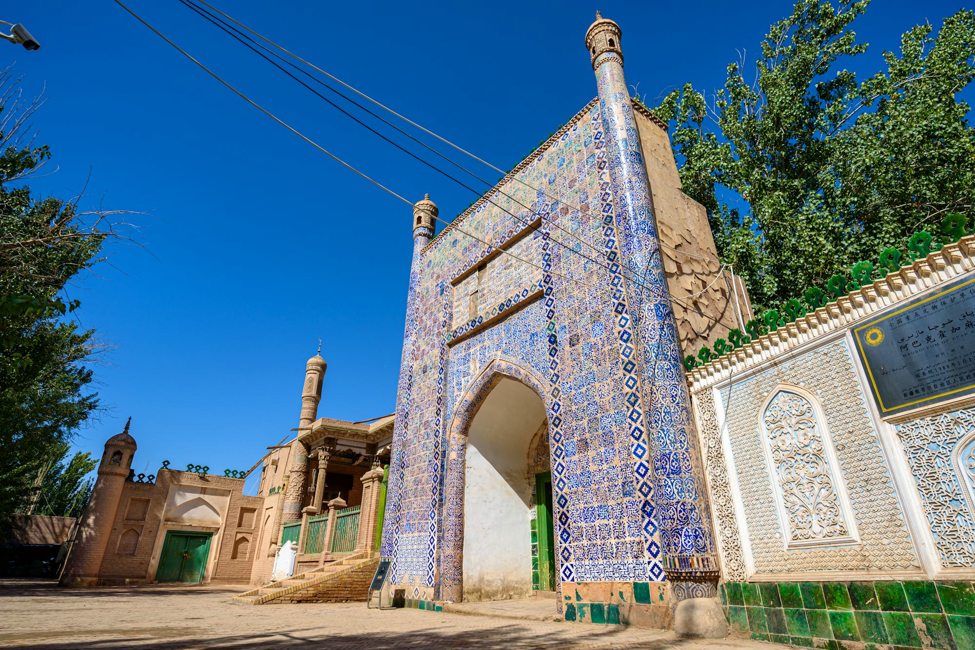 zwischen hohen Pappeln liegt. Der reich verzierte Bau mit seinem Turm aus glasierten Kacheln, die im Sonnenlicht schimmern, gilt als Meisterwerk uigurischer Architektur. Die Anlage stammt aus dem 17. Jahrhundert und diente als Familienfriedhof eines einflussreichen islamischen Herrschers der Region. In China ist das Mausoleum auch als Grab von Xiang Fei bekannt – jener uigurischen Konkubine des Kaisers Qianlong aus der Qing-Dynastie (1644–1911), um die sich zahlreiche Legenden ranken.