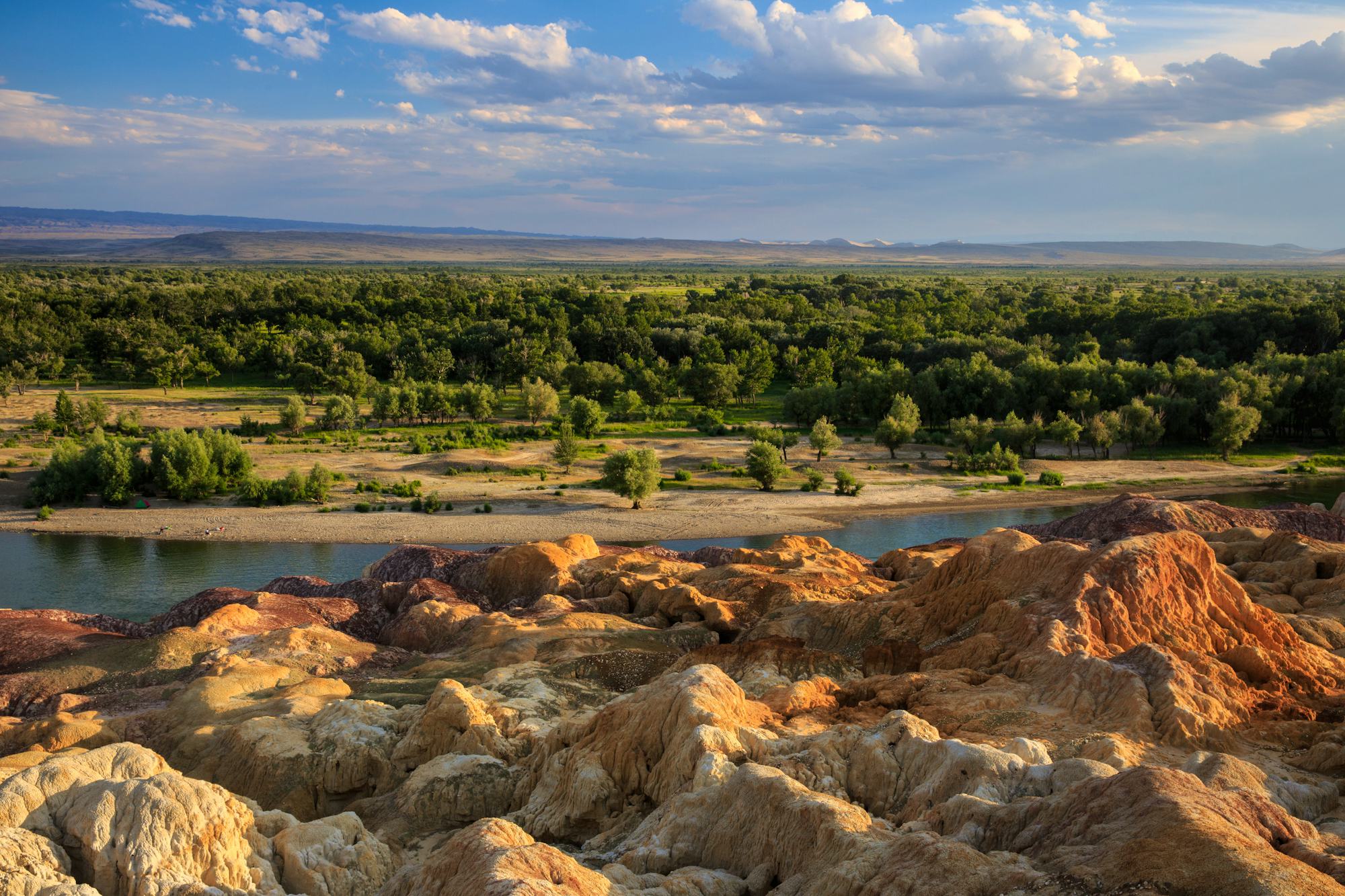 Diese einzigartige Erosionslandschaft am Ufer des Irtysch-Flusses wurde über Jahrmillionen von Wind und Wasser geformt. In der Abendsonne entfaltet sich hier ein faszinierendes Farbenspiel: Geschichtete Gesteinsschichten leuchten in Rostrot, Ockergelb und Türkisgrün. Aufgrund dieses beeindruckenden Naturschauspiels trägt der Ort den poetischen Namen „Farbiger Strand“. Die bizarr geformten Felsen wirken wie ein natürliches Kunstwerk und bilden einen spektakulären Kontrast zum tiefblauen Fluss.