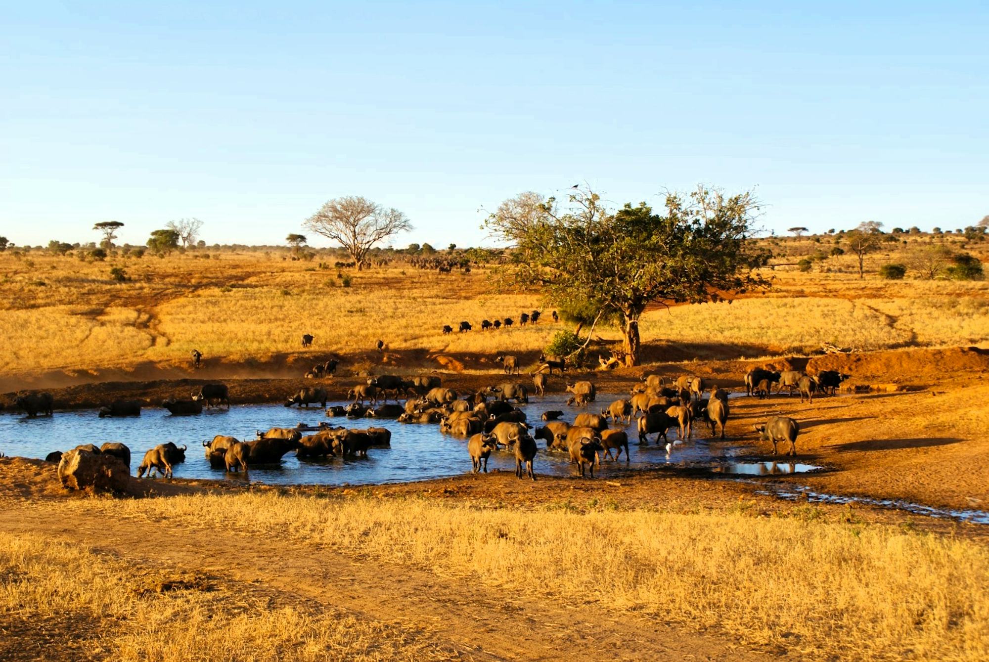 Es gibt hier eine große Anzahl an Wildtieren und auch große Elefantenherden. Das private Schutzgebiet bildet zusammen mit den Taita Hills einen erweiterten Korridor, zusammen mit dem Tsavo West-Nationalpark nach Tansania bis hin zum Mkomazi-Nationalpark. Die rote Erde prägt die Landschaft und bietet den Tieren einen optimalen Lebensraum in der Savanne. Ihre Lodge bietet Ihnen eine fantastische Aussicht über das Schutzgebiet. Besuchen Sie den Fotospot der Unterkunft. Hier können Sie wunderbar die Tiere aus einer ganz anderen Perspektive beobachten, welche zum Wasserloch kommen um zu Trinken oder sich abzukühlen.