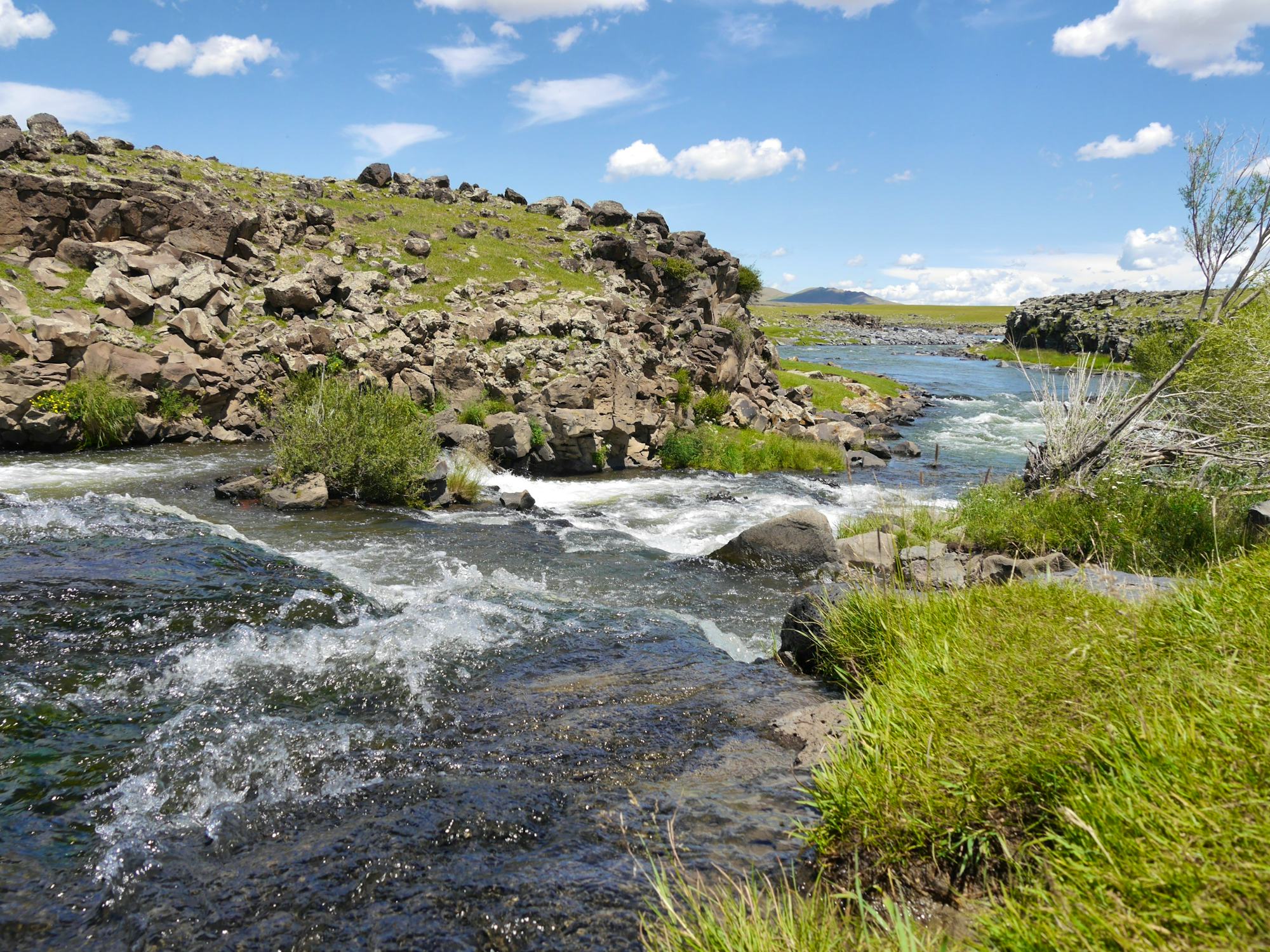 Zusammen mit der gesamten Gruppe fahren Sie zum Großen Orkhon-Wasserfall. Hier trennen sich die Gruppen.