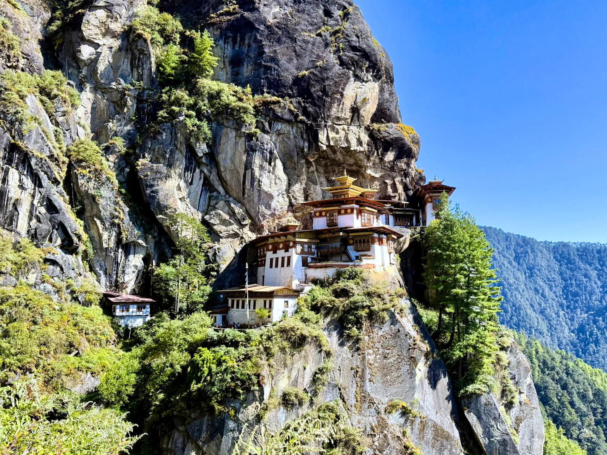Für alle aktiven Gäste besteht heute die Möglichkeit, auf das Programm der Reisegruppe zu verzichten und einen fakultativen Wanderausflug mit Ihrer Reisebegleitung und einem örtlichen, englischsprachigen Reiseleiter zum Kloster Taktsang, auch bekannt als Tigernest, zu unternehmen. Das berühmte buddhistische Kloster befindet sich auf einer Höhe von 3.120 Metern über dem Meeresspiegel und verdankt seinen Namen einer alten Legende, bei dem der Guru auf einem Tiger aus Tibet kommend hier einflog und den buddhistischen Glauben in Tibet verbreitete. Steil schlängelt sich der sandige-großsteinige Weg, beginnend in 2.600 Metern Höhe, zunächst zu einer Cafeteria in 2.900 Metern Höhe hinauf. Der weitere Aufstieg erfolgt vorbei an mehreren Aussichtspunkten mit bunten Gebetsfahnen bis Sie vis-a-vis des Tigernest-Klosters stehen; nun geht es über Stufen einhundertfünfzig Meter nach unten. Im Anblick eines Wasserfalls steigen Sie dann über zweihundertfünfzig Stufen die Felswand zum Kloster hinauf. Die Anstrengung des dreistündigen Aufstieges über insgesamt achthundert Höhenmeter wird mehrfach am Wege mit unvergesslichen Blicken auf das berühmte Tigernest belohnt; am Ziel besichtigen Sie eines der ältesten Klöster Bhutans inmitten der Felswand – ein durchaus sportliches Erlebnis, das Sie nicht vergessen werden! Ihr Mittagessen nehmen Sie in der Cafeteria am Pilgerweg im Anblick des Klosters ein. Nach sieben Stunden – davon fünf Stunden reiner Gehzeit – erreichen Sie den Wanderausgangspunkt.