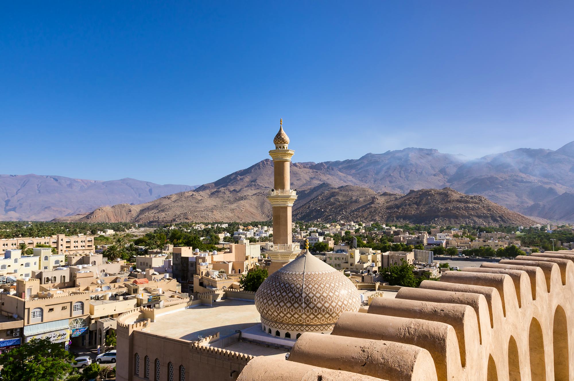 Nach einem Bummel über den lebhaften Suq von Nizwa, wo Sie traditionelle Handwerkskunst, duftende Gewürze und kunstvoll gefertigte Silberwaren und die bekannten Krummdolche entdecken können, führt Sie die Reise weiter zu den majestätischen Bergen Omans. Ihr nächstes Ziel ist die malerische Oase Birkat Al-Mauz, eine grüne Idylle am Fuße des Gebirges mit alten Lehmhäusern und einem beeindruckenden Falaj-Bewässerungssystem.