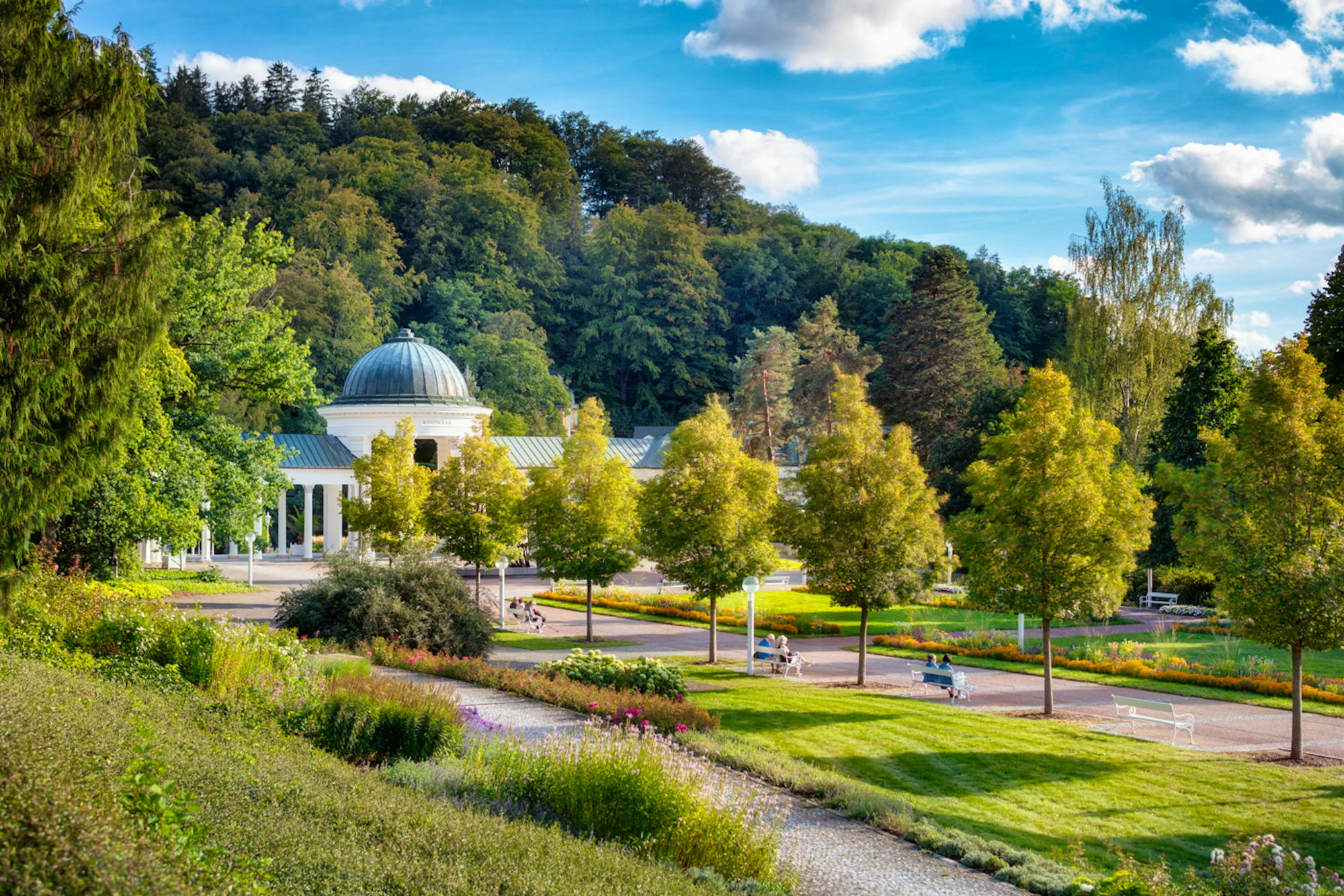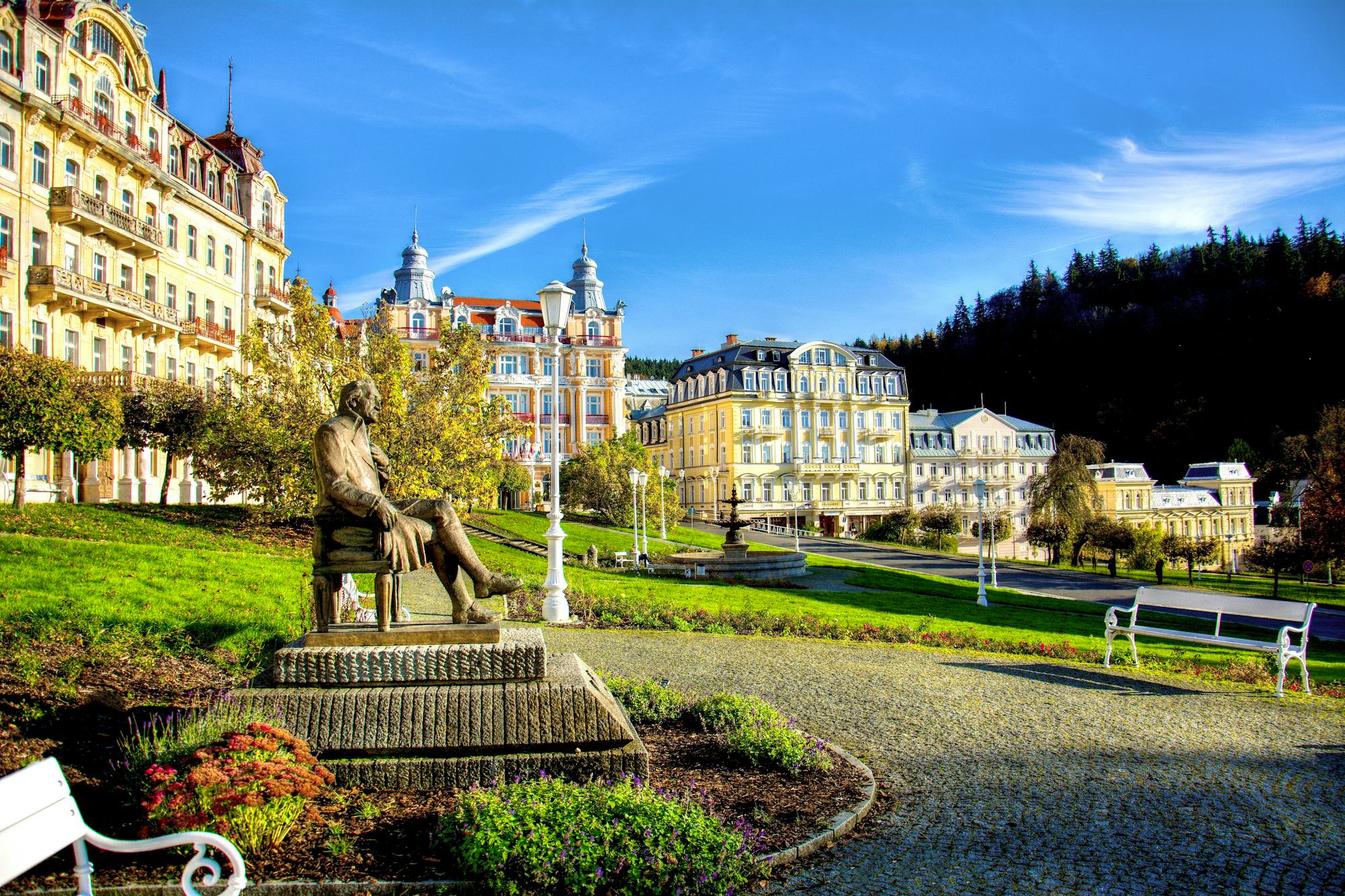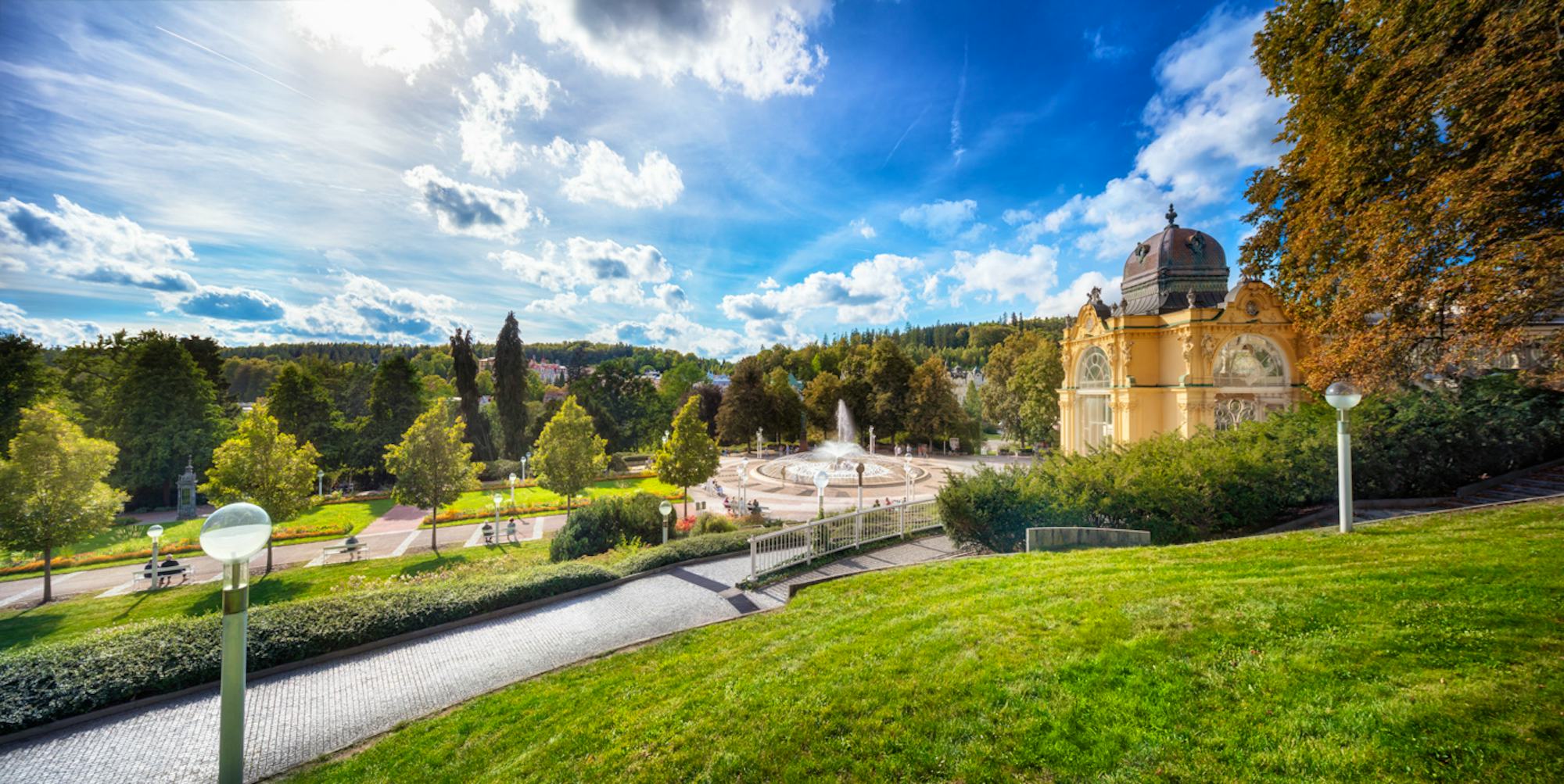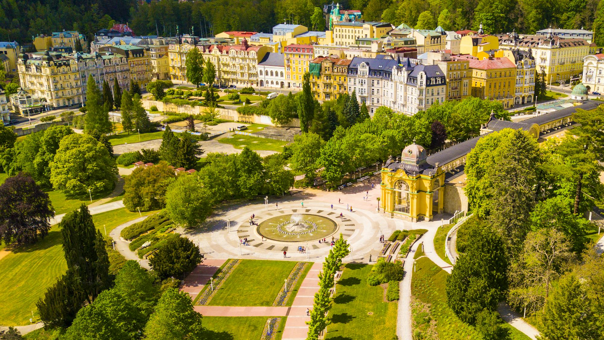 Marienbad (Marianske Lazne), seit 1818 als Heilbad offiziell anerkannt, wird auch als "Bad der 40 Quellen" bezeichnet. Der Kurort liegt am Fuße des Kaiserwaldes und ist fast vollständig von bewaldeten Hügeln umgeben, die dem Ort wohltuende Stille und Ruhe verleihen. Viele Berühmtheiten wie Johann Wolfgang von Goethe, Richard Wagner, Franz Lehar, Frederic Chopin, Stefan Zweig und Thomas A. Edison fanden hier Genesung und Erholung. Heute präsentiert sich der Ort als Symbiose von böhmischer Tradition und Moderne. Ein reichhaltiges Kulturprogramm mit Konzerten, Theaterbesuchen und vielfältigen Tanzmöglichkeiten bietet Gelegenheit zur Abwechslung in jeder Jahreszeit. Erlebenswert ist die eindrucksvolle Singende Fontäne vor der berühmten Kurkolonnade. Seit dem Jahr 2023 gehört Marienbad auch zu den anerkannten Luftkurorten. Der Aufenthalt in einer natürlichen Umgebung und die Bewegung an der frischen Luft tragen dazu bei, psychische Spannungen abzubauen, die Schlafqualität zu verbessern und die allgemeine Immunabwehr des Körpers zu stärken.