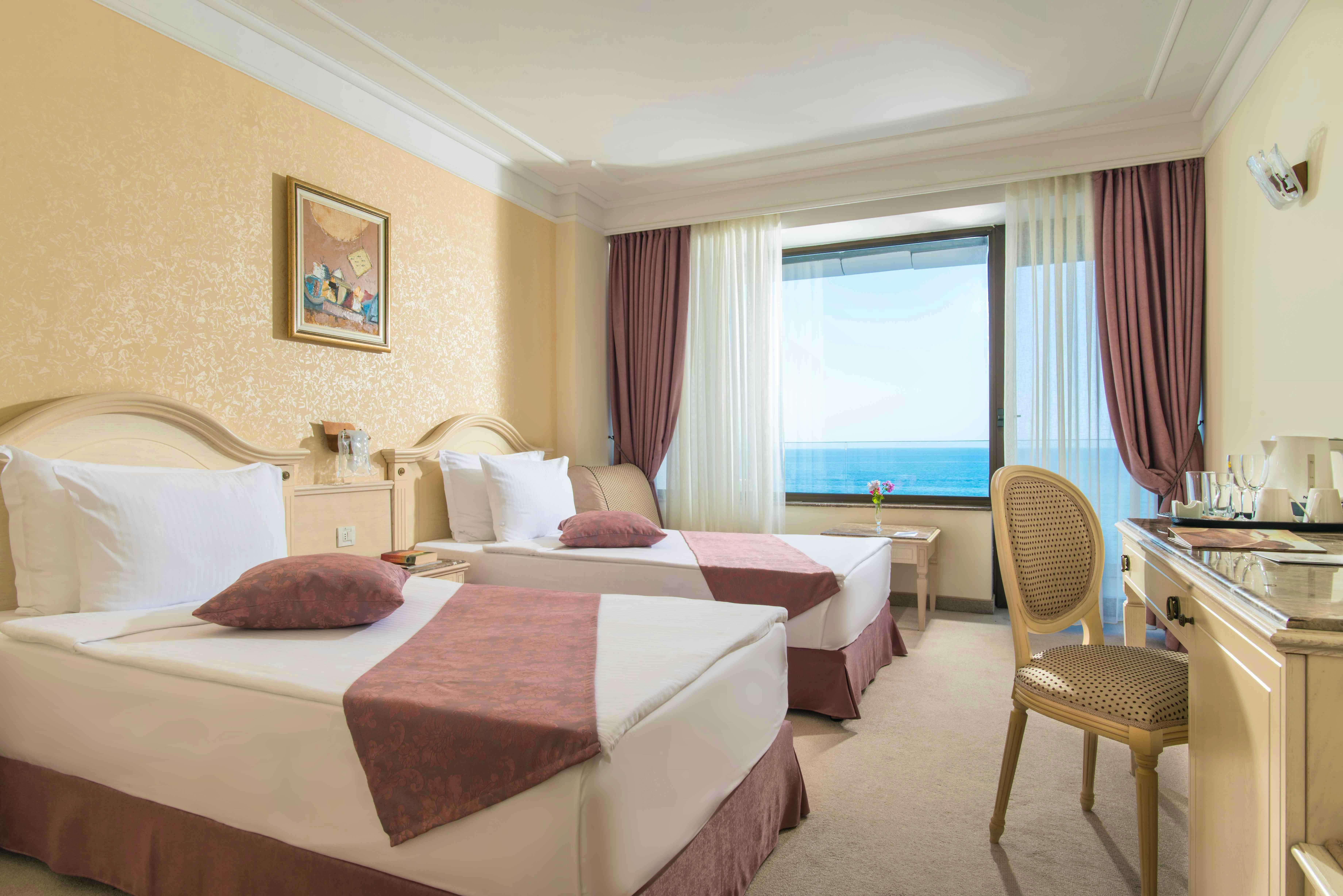 Die Doppelzimmer Meerblick/Parkblick verfügen über einen LCD-TV, Telefon, Safe, Minibar, WLAN, Sitzgelegenheit, Föhn, Wasserkocher für Tee und Kaffee Balkon mit Balkonmöbel mit Blick auf das Meer oder den Park.