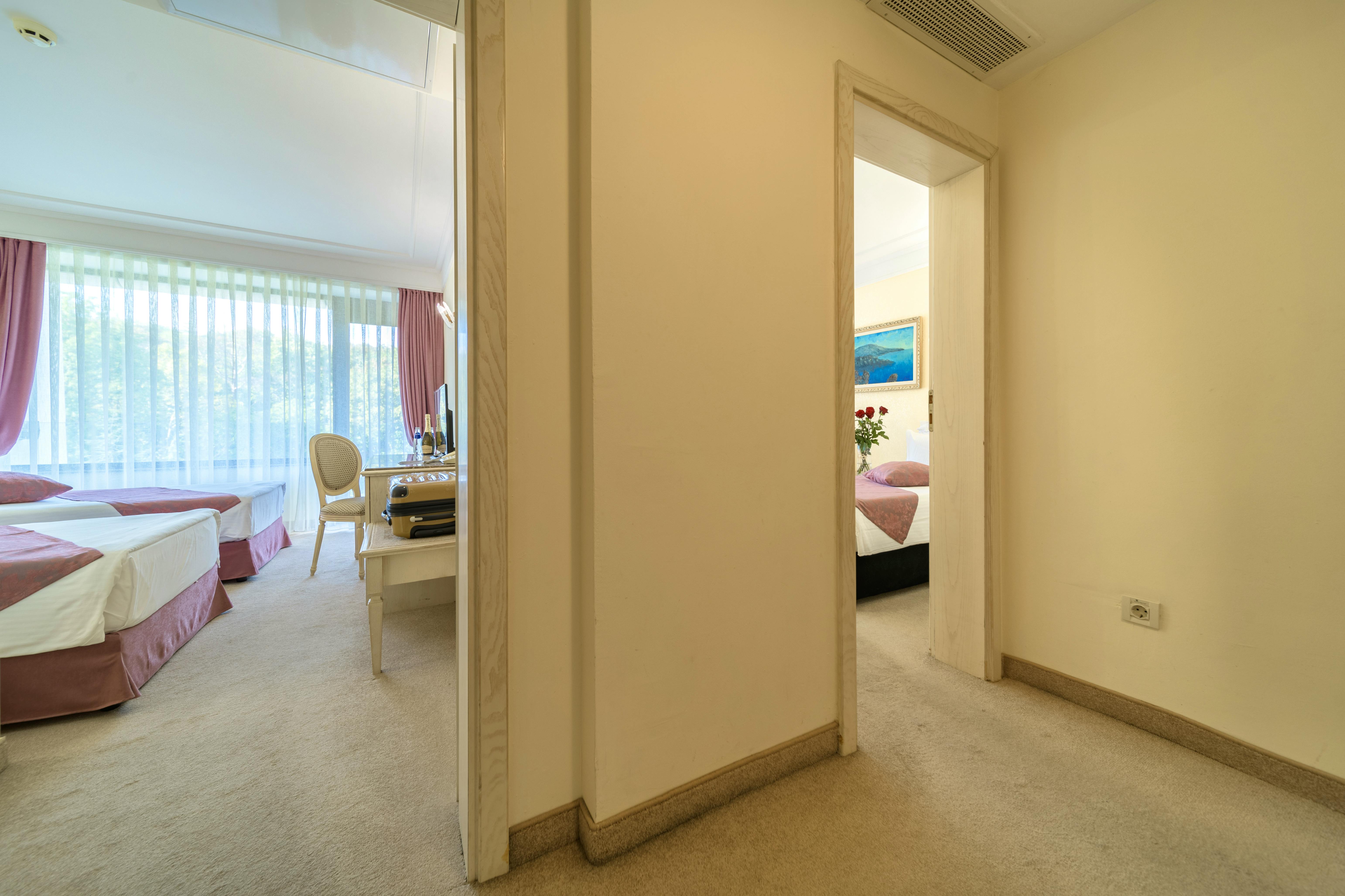 Die Doppelzimmer Deluxe Meerblick/Parkblick für max. 4 Personen sind geräumiger und verfügen zusätzlich über einen großen Raum mit King Size Bett und Sitzecke, 2 Balkone.