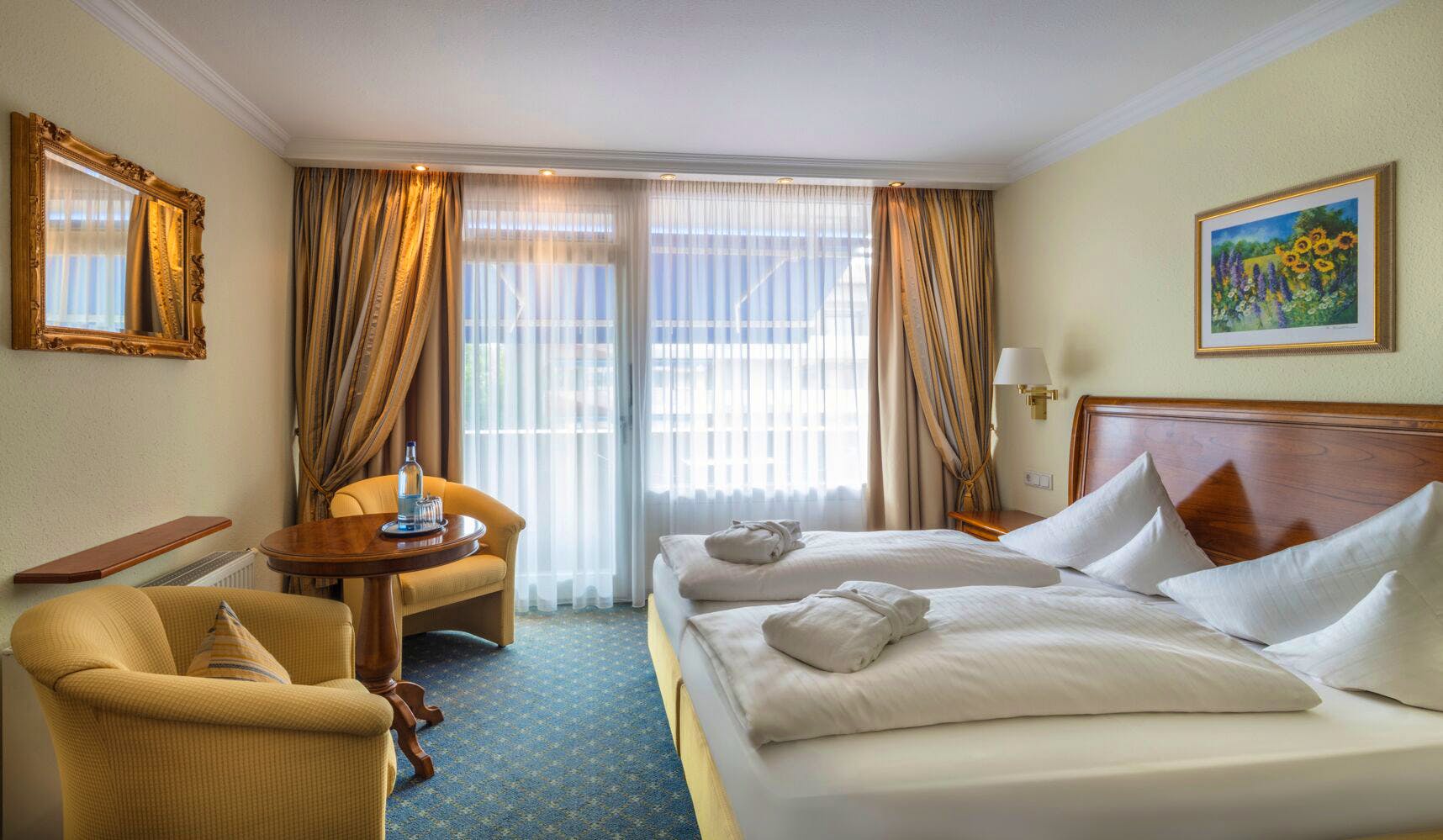 Die Zimmer der Kategorie Superior verfügen über Box-Spring-Betten mit höheren, breiteren Matratzen, einer Dusche mit flachem Einstieg sowie zusätzlich über einen Tisch mit Stühlen.