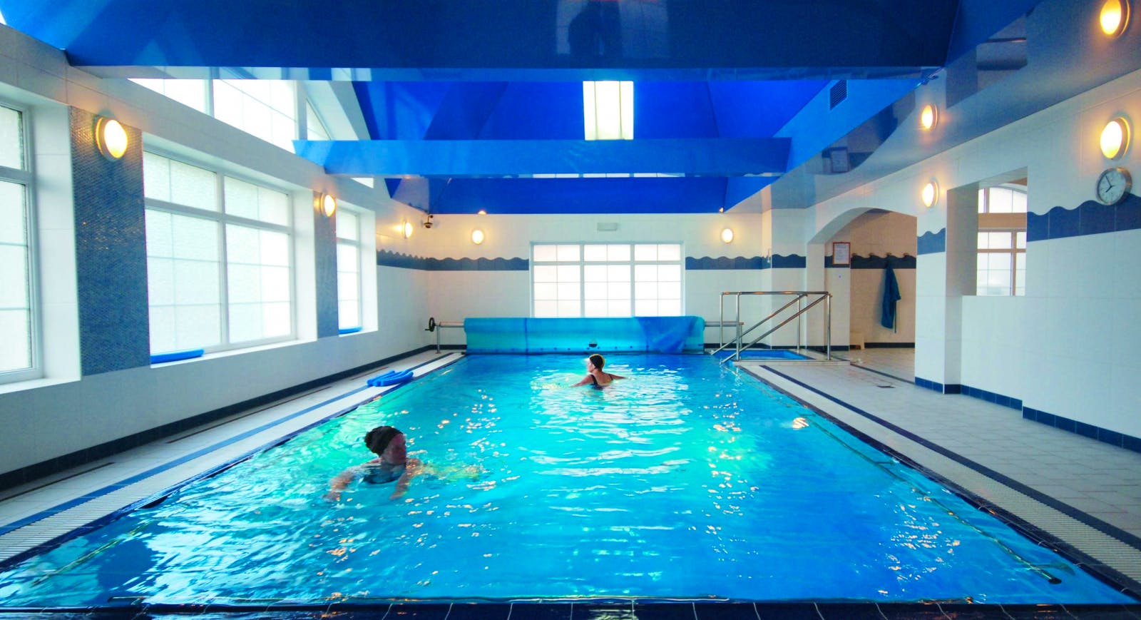 Das Hallenbad (ca. 10 x 14 Meter) besitzt eine Gegenstromanlage, zwei Whirlpools (im Freien und im Innenbereich jeweils einen Whirlpool) und zwei Sauna (ca. 8 € pro Stunde für 1 bis 5 Personen) und einen Fitnessraum.