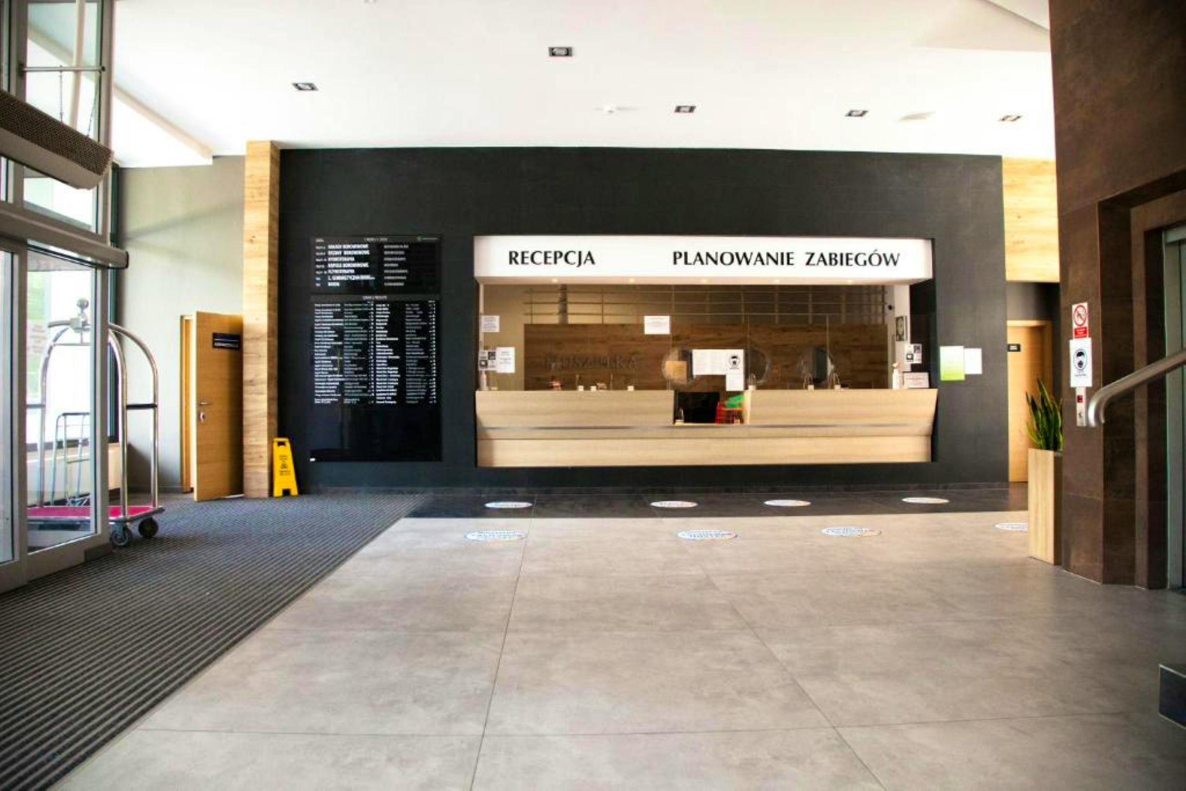 Hotelansicht Hotel Muszelka – © IdeaSpa Lobby vom Hotel Muszelka – © IdeaSpa Travel Rezeption im Hotel Muszelka – © IdeaSpa Travel Buffet Hotel Muszelka – © IdeaSpa Travel Solebad im Hotel Muszelka – © IdeaSpa Travel