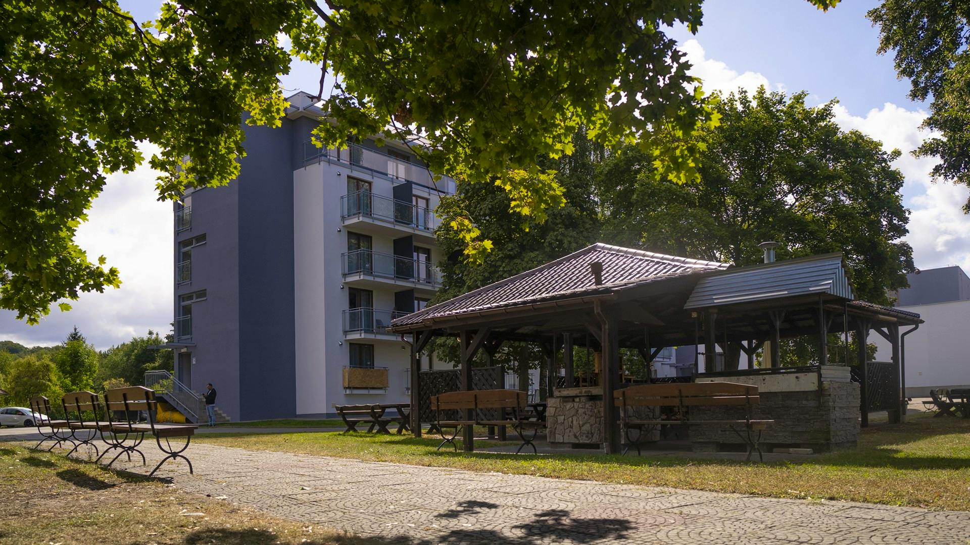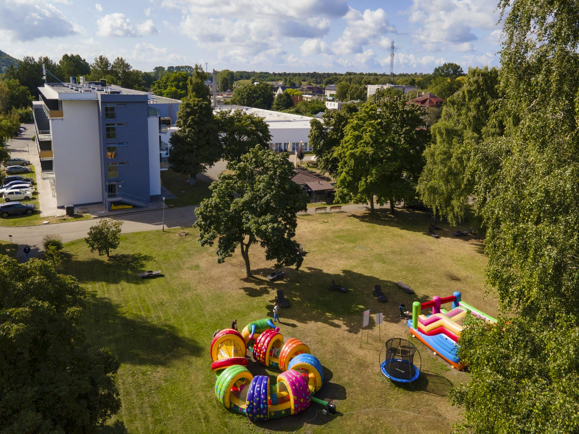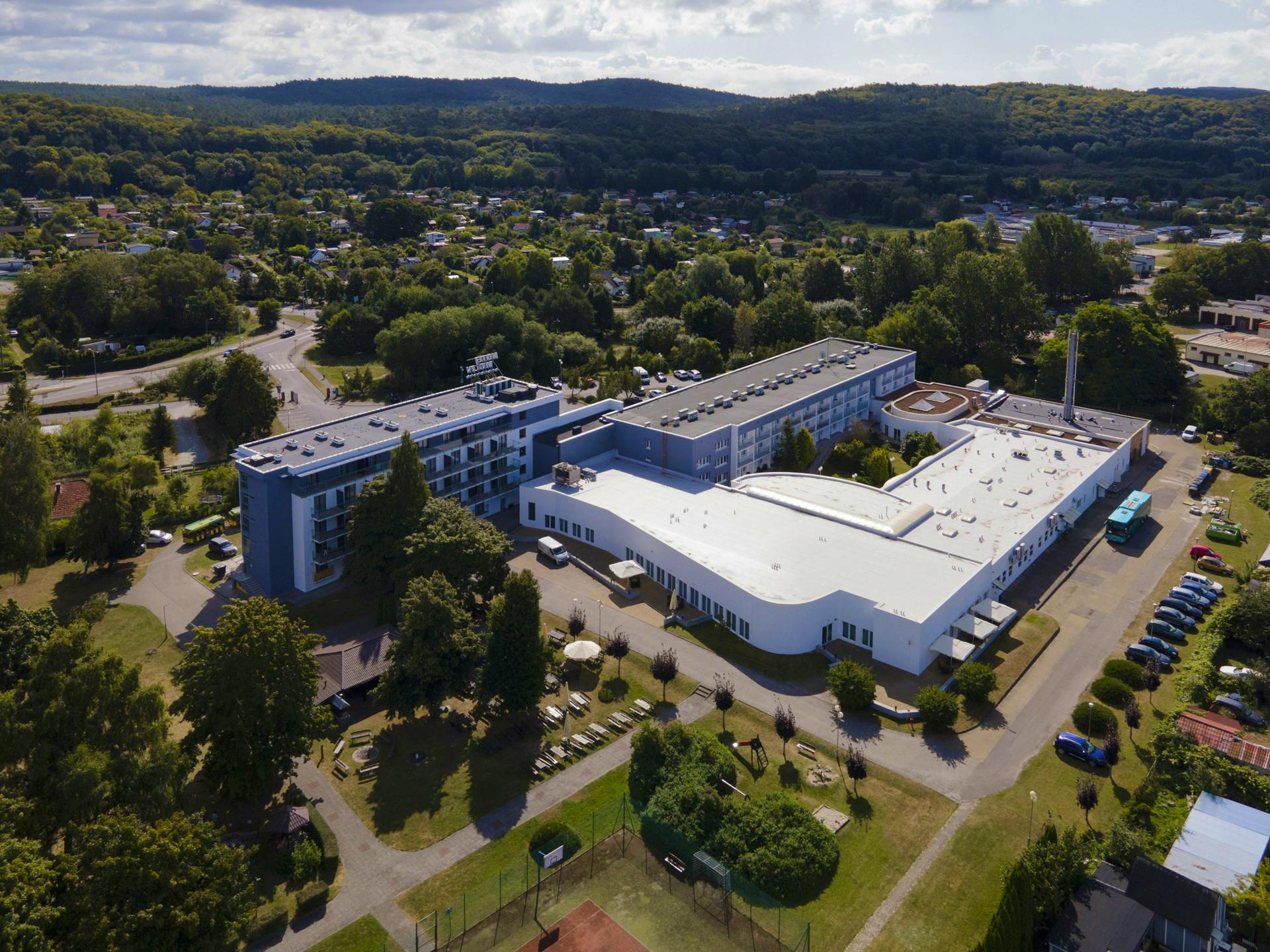 Außenansicht Hotel Wolin – © IdeaSpa Travel Vogelperspektive Hotel Wolin – © IdeaSpa Travel Schwimmbad im Hotel Wolin – © IdeaSpa Travel Hotelgarten Hotel Wolin – © IdeaSpa Travel Gymnastikraum im Hotel Wolin – © IdeaSpa Travel