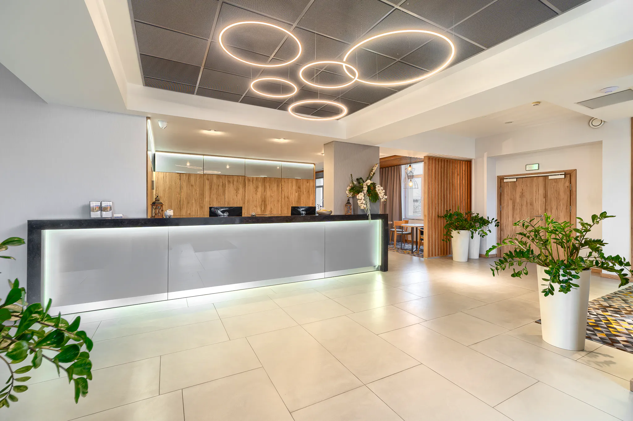 Schwimmbad im Hotel Afrodyta Spa – © IdeaSpa Restaurant mit Buffet im Hotel Afrodyta Spa – © IdeaSpa Travel Aufenthaltsbereich im Afrodyta Spa – © IdeaSpa Rezeption Hotel Afrodyta Spa – © IdeaSpa Zimmerbeispiel im Afrodyta Spa – © IdeaSpa