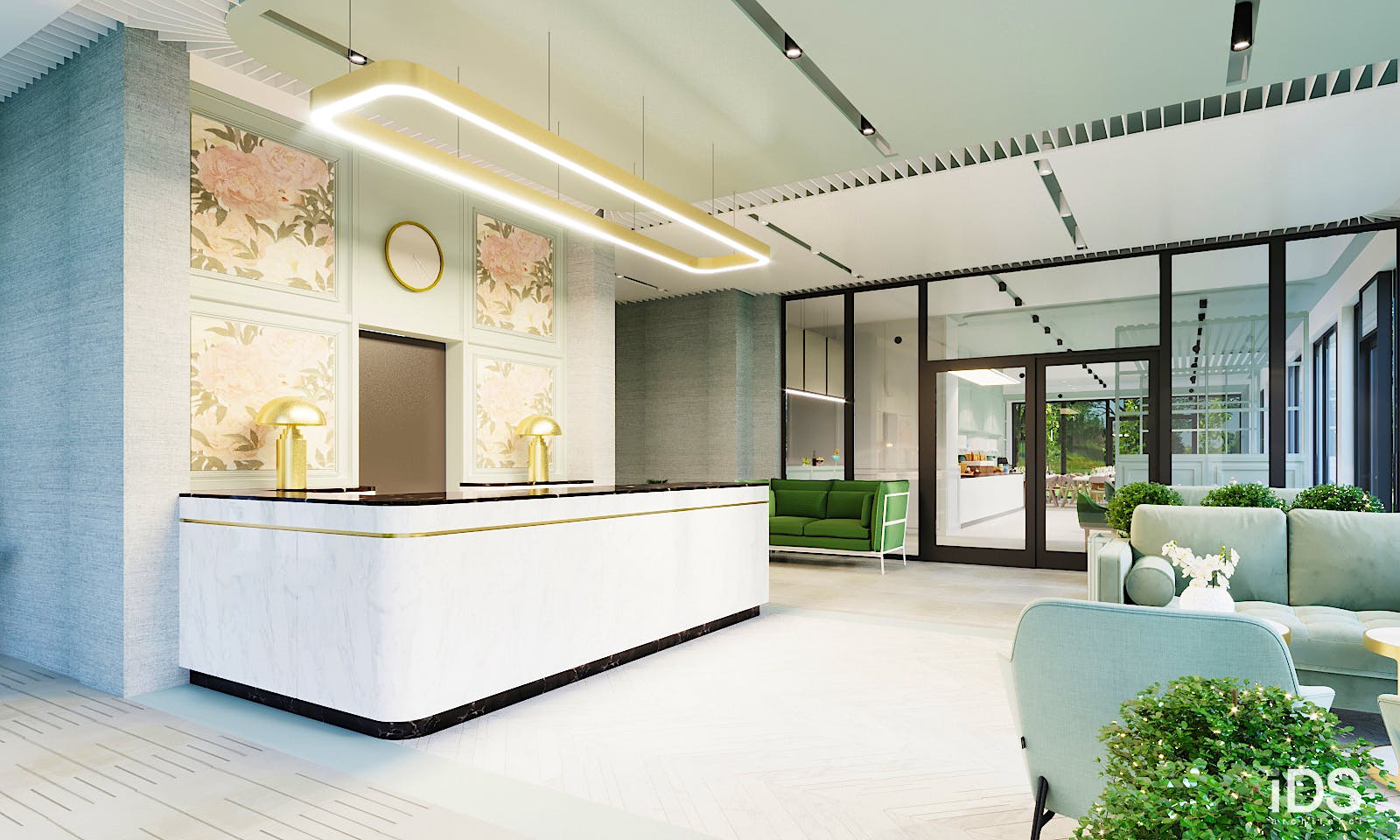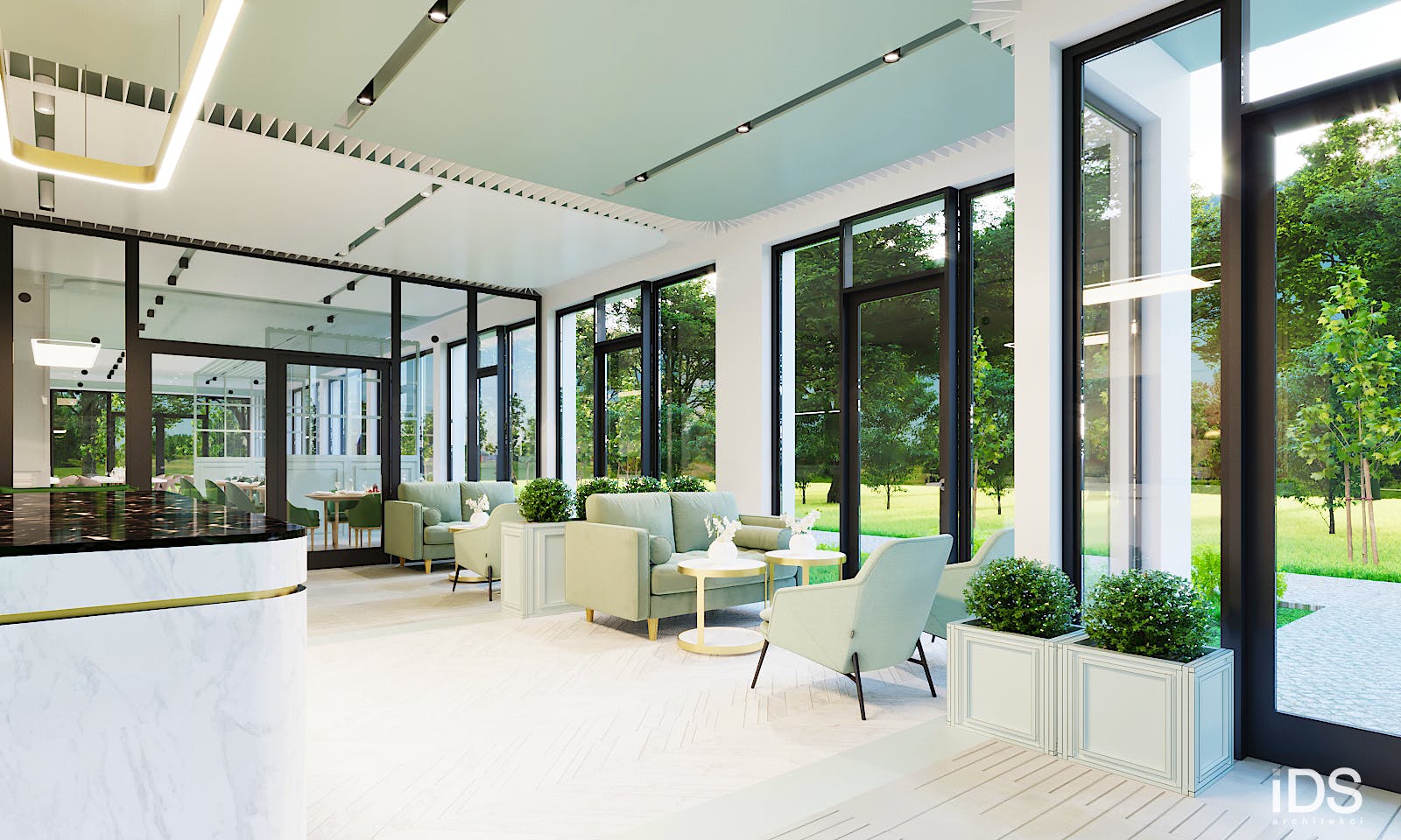 Das moderne Kurhotel verfügt über eine Rezeption mit Aufenthaltsraum, Lift, Speisesaal, Bar, Café und eine Lobby-Bar.