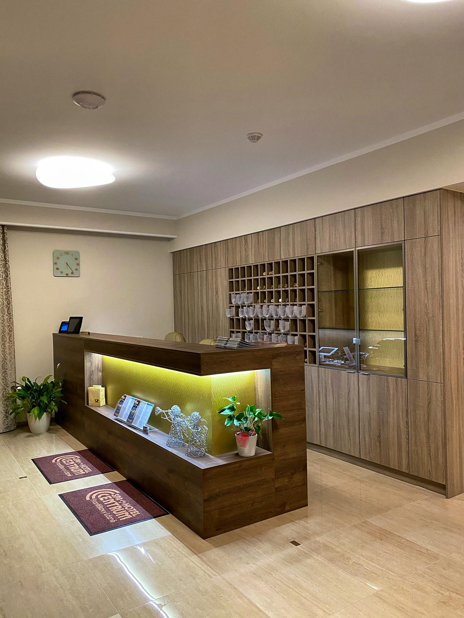 Zur Ausstattung gehören eine Rezeption mit Lobby und gemütlichen Sitzplätzen, 2 Lifte, Café mit Terrasse, Restaurant, kleine Bibliothek, Balneotherapieabteilung, Sonnenterrasse mit Liegen und Schirmen und ein Fitnessraum mit Fahrrad-Ergometer.