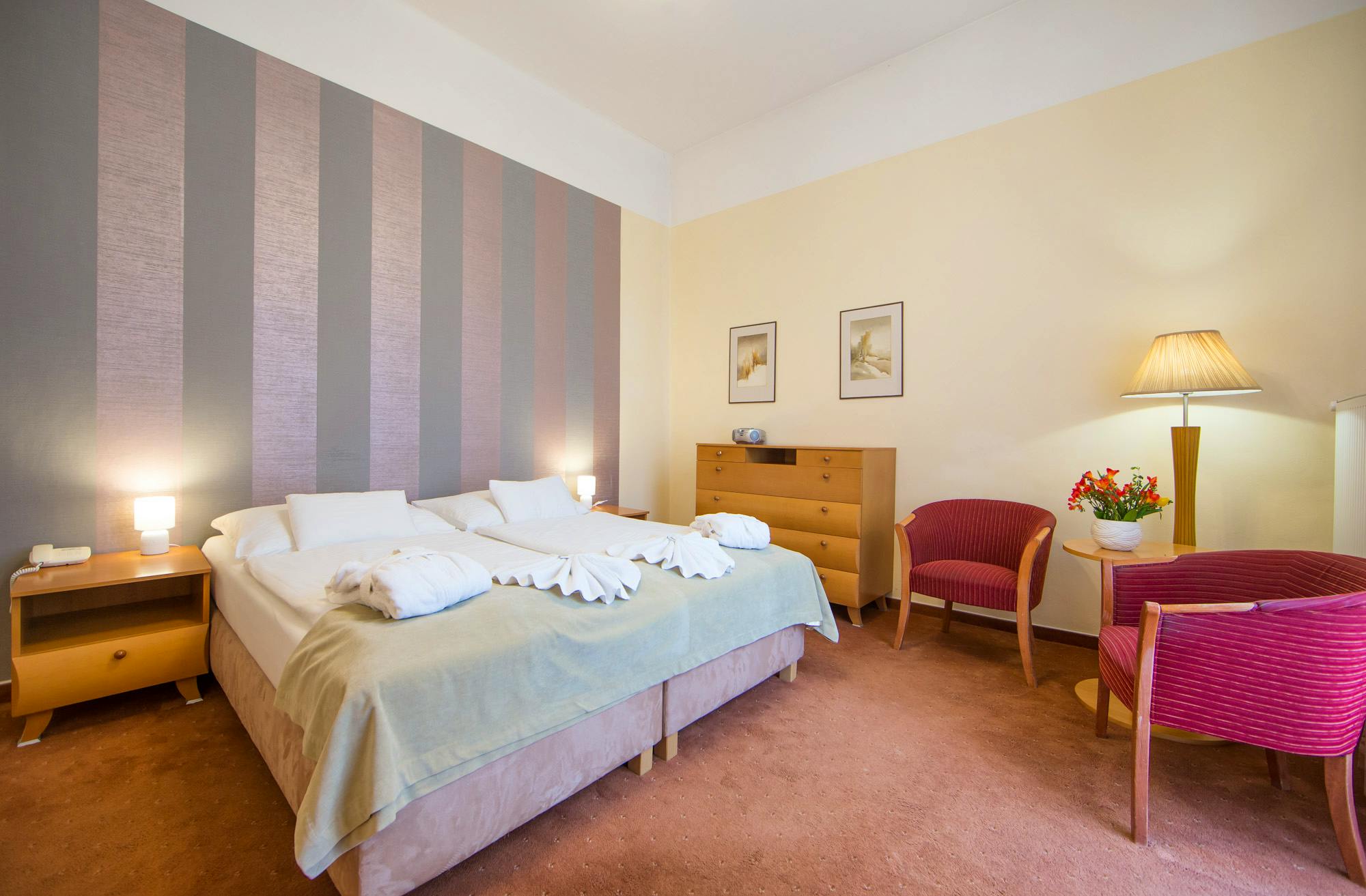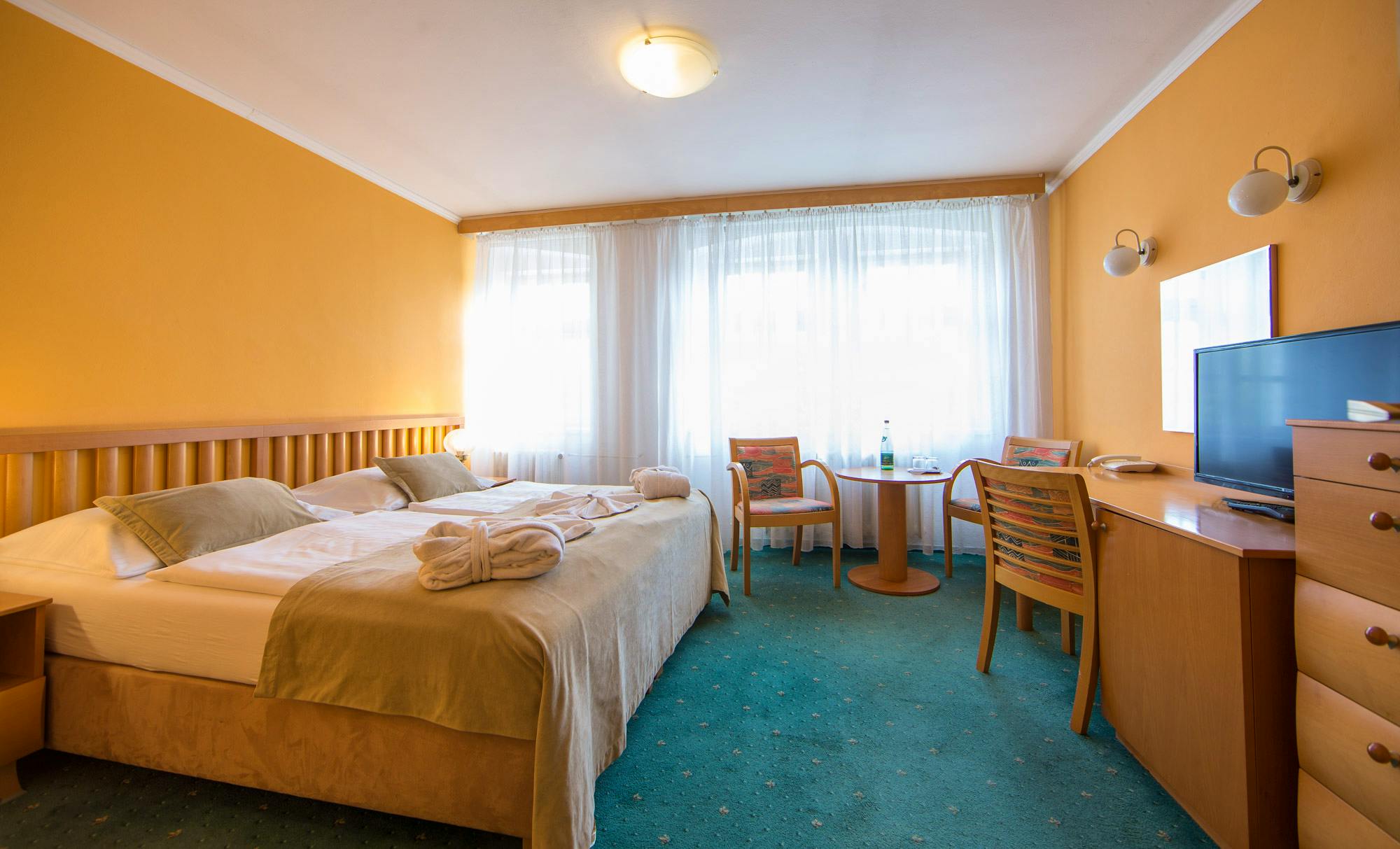 Die 60 komfortabel eingerichteten Zimmer verfügen über Dusche oder Bad/WC, Föhn, SAT-TV (auch deutsche Sender), Telefon, Kühlschrank, Minibar, Safe (kostenfreie Nutzung), WiFi und haben teilweise einen Balkon. Die Zimmer der Kategorie Komfort sind geräumiger.