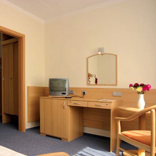 Der Komplex aus den drei miteinander verbundenen Kurhäusern Curie, Elektra und Praha verfügt über Lift, Terrasse, Wintergarten mit Snack- und Tagesbar, Kurabteilung und WiFi-Zonen (Rezeption und Café)