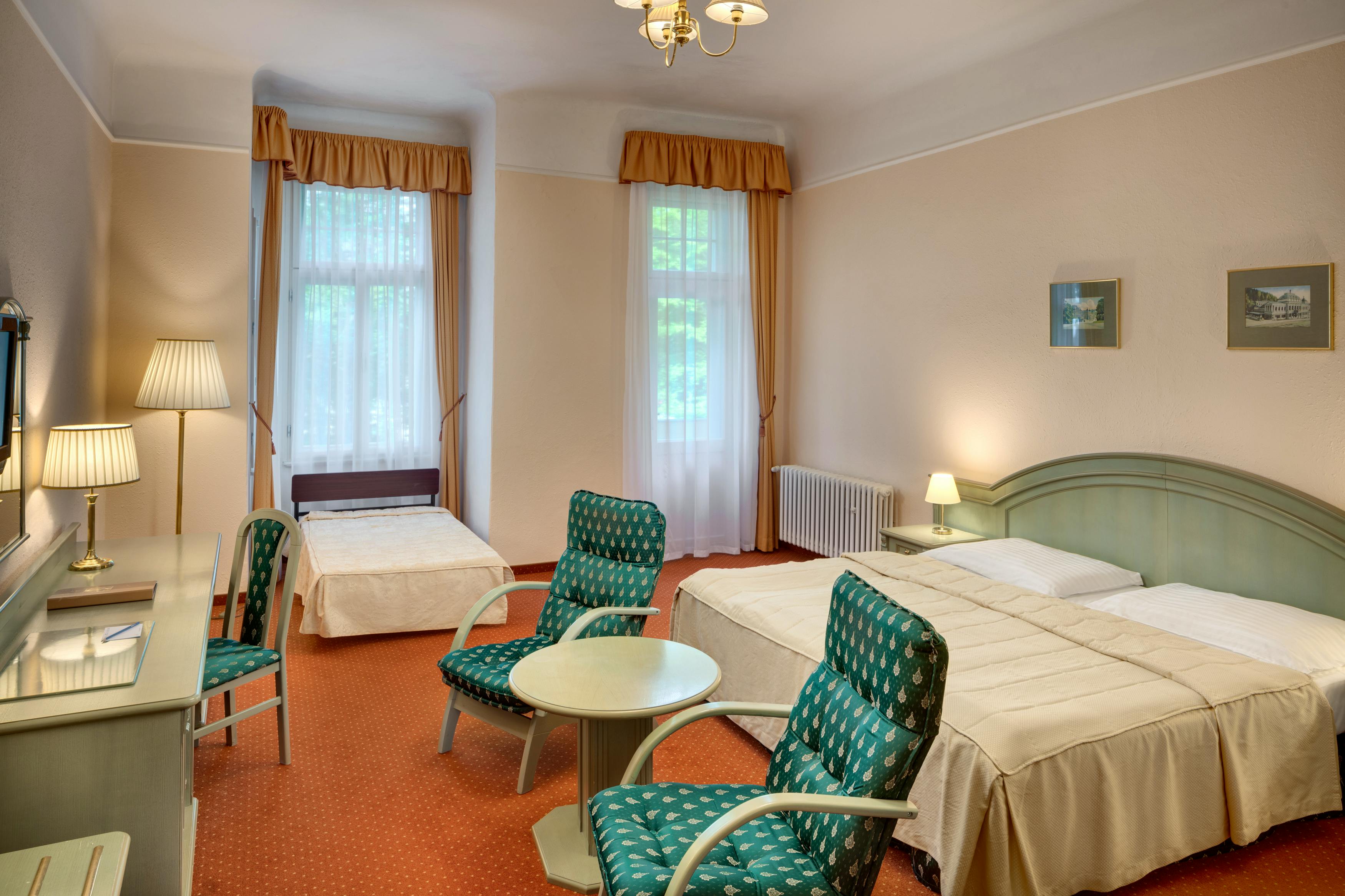 Marienbad - Spa Hotel Svoboda - Schwimmbad – © Lecebne lazne Marianske Lazne a.s. Ensana Health Spa Hotel Svoboda in Marienbad – © Ensana Health Spa Hotel Svoboda Marienbad - Spa Hotel Svoboda - Restaurant – © Lecebne lazne Marianske Lazne a.s. Marienbad - Ensana Health Spa Hotel Svoboda - Mineralbad – © Ensana Health Spa Hotels Marianske Lazne Marienbad - Ensana Health Spa Hotel Svoboda - Zimmerbeispiel Kategorie Komfort – © Jan Prerovsky