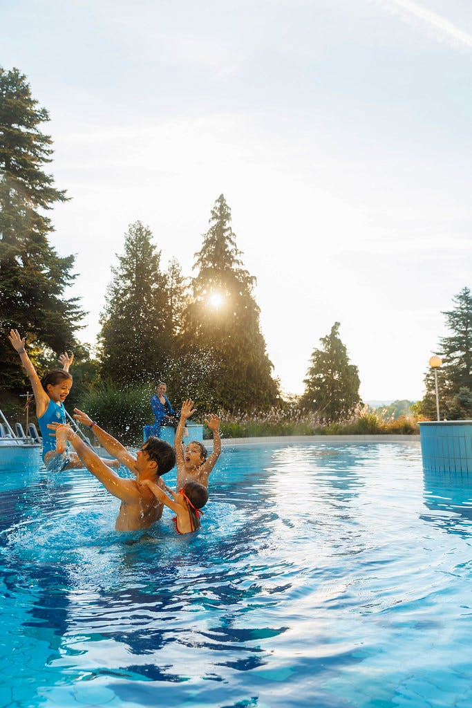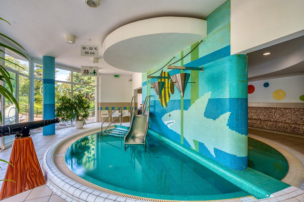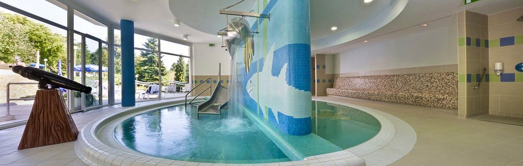 Genießen Sie das Erlebnisbad mit Innen- und Außenpool (200 Quadratmeter), Kinderwasserwelt mit Innenrutschen und Kneipp-Tretbecken im Garten (von Mai bis September geöffnet).