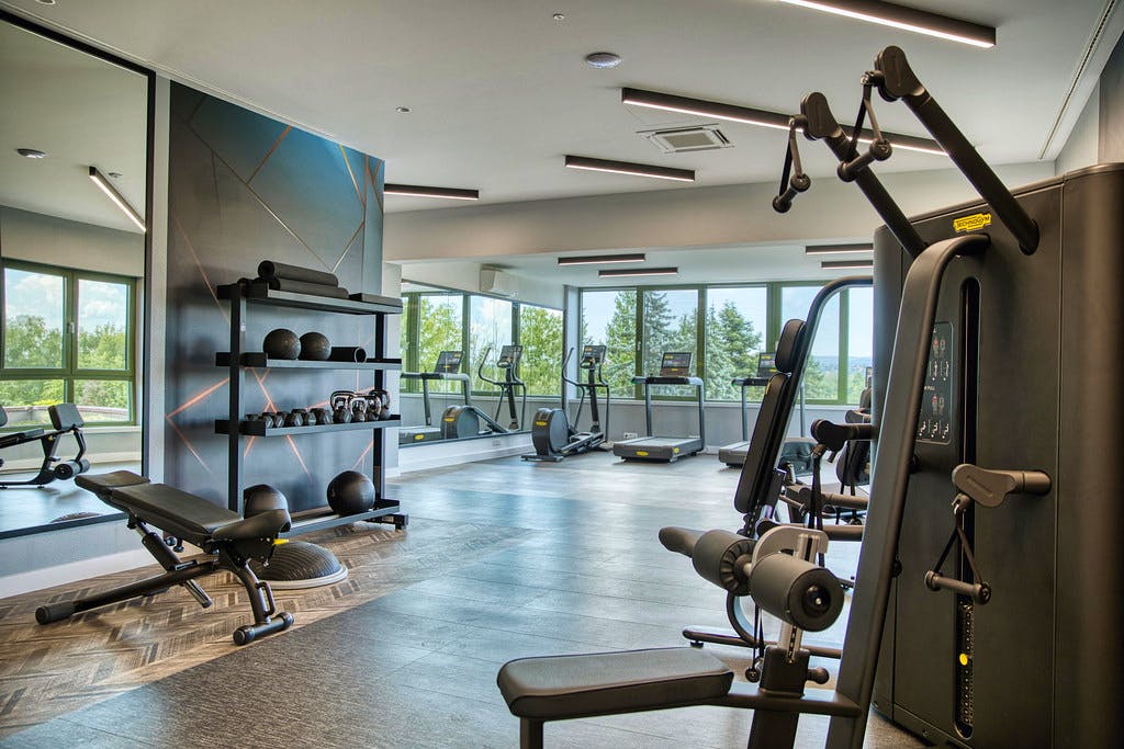 Ein modernisierter Fitnessraum mit Aussicht aus Panoramafenstern steht Ihnen zur Verfügung.