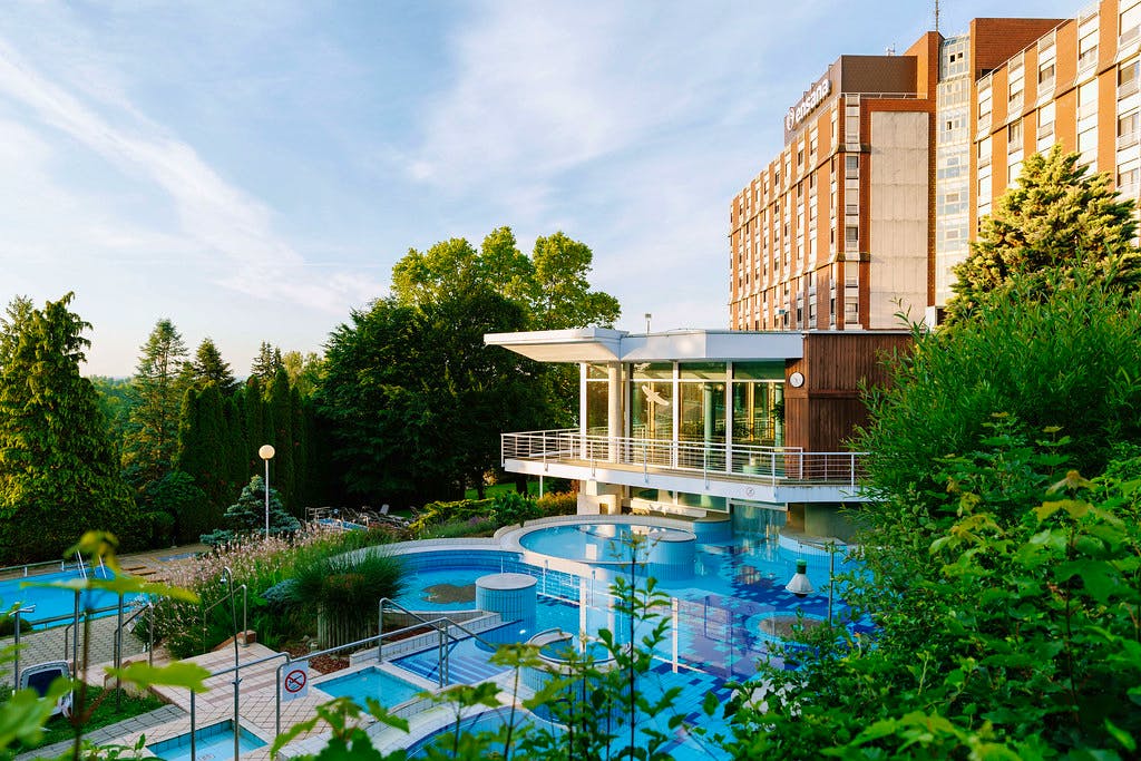 Das 4-Sterne Ensana Thermal AQUA Health Spa Hotel in Heviz in einem Park oberhalb des berühmten Hevizer Thermalsees. Der See ist nur ca. 400 Meter vom Hotel entfernt. Der Kurort Heviz befindet sich nordwestlich des Balatons (Plattensee) inmitten einer reizvollen Landschaft.