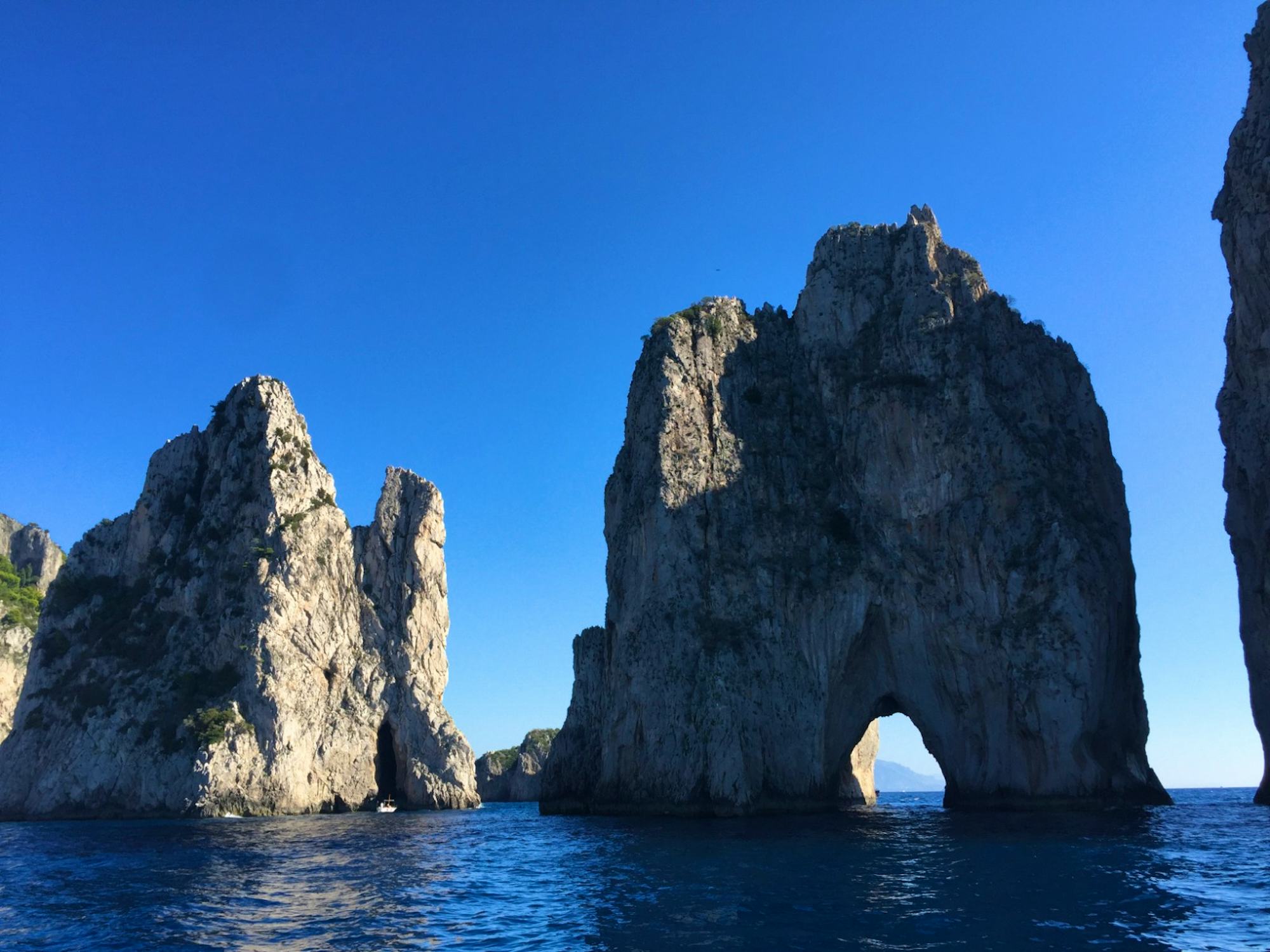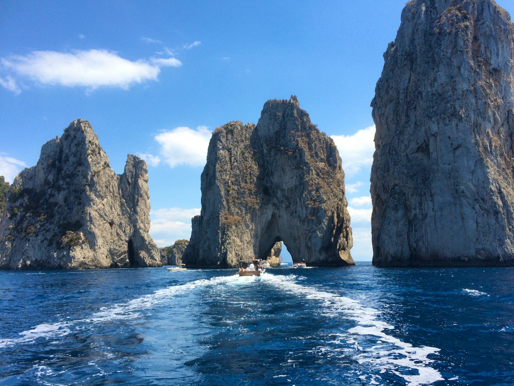 Gemütlich laufen Sie nach dem Frühstück hinunter zum Hafen Marina Grande (Taxifahrt oder Fahrt mit der Standseilbahn natürlich möglich!). Hier steigen Sie auf das Boot, welches Sie einmal um die ganze Insel schippert. Zunächst passieren Sie den Strand von Marina Grande und später die Bäder von Tiberius (Bagni di Tiberio). Der folgende Abschnitt der zerklüfteten Küste Capris wird von einem Kalkriff dominiert. Hier erblicken Sie vom Schiff aus eine reiche Vegetation. Nachdem Sie die Punta di Gradola hinter sich gelassen haben, erreichen Sie die berühmte Blaue Grotte (Grotta Azzurra). Entlang der Westseite der Insel kommen Sie nun an verschiedenen Buchten vorbei und erreichen am südwestlichen Ende der Insel den Leuchtturm von Punta Carena. Die Heiligengrotte (Grotta dei Santi) sowie die Rote Grotte (Grotta Rossa) und Grüne Grotte (Grotta Verde) erblicken Sie als Nächstes an der Südküste. Jede der Grotten besitzt ihren eigenen Reiz. Unmittelbar nach der Bucht des Sarazenenturms (Cala di Torre Saracena) erreichen Sie die Bucht von Marina Piccola. Nun sehen Sie die Wahrzeichen Capris - die Faraglioni-Felsen - vom Wasser aus. Sie sind zum Greifen nah! Entlang der Ostküste, die stark von Erdrutschen und zerklüfteten Felsen dominiert wird, erreichen Sie erneut den Hafen Marina Grande.