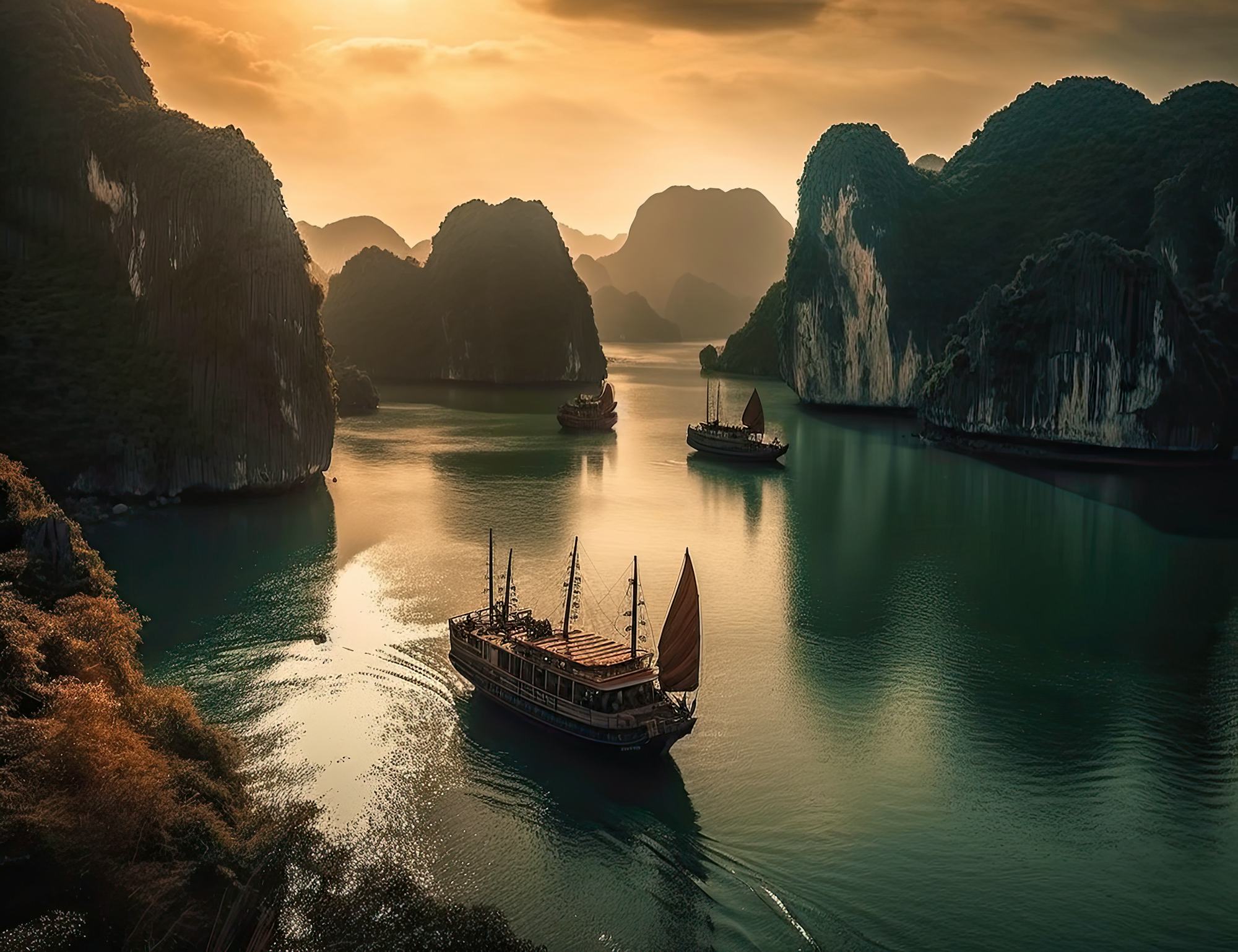 Die bizarre Welt tausender Inseln mit bis zu 100 Meter hohen Karstfelsen und unzähligen Grotten ist die malerische Kulisse Ihrer Fahrt auf der Dschunke, bei der Sie am frühen Morgen an einem Tai Chi-Kurs teilnehmen können und im Anschluss einen köstlichen Brunch genießen.
