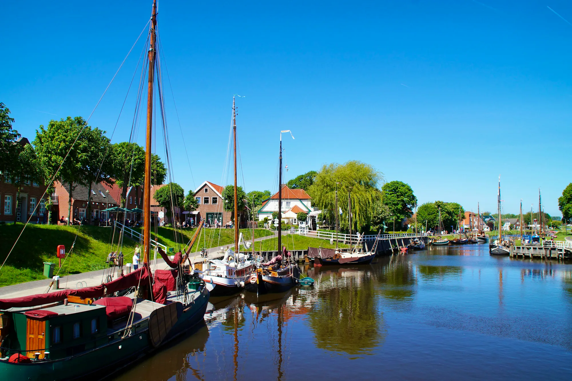 Zurück bei den Friesen legen Sie eine Pause am Museumshafen von Carolinensiel ein. Alte Schiffe säumen sowohl den Stadtanleger als auch den Weg entlang des Harlinger Siels zur neuen Schleuse.