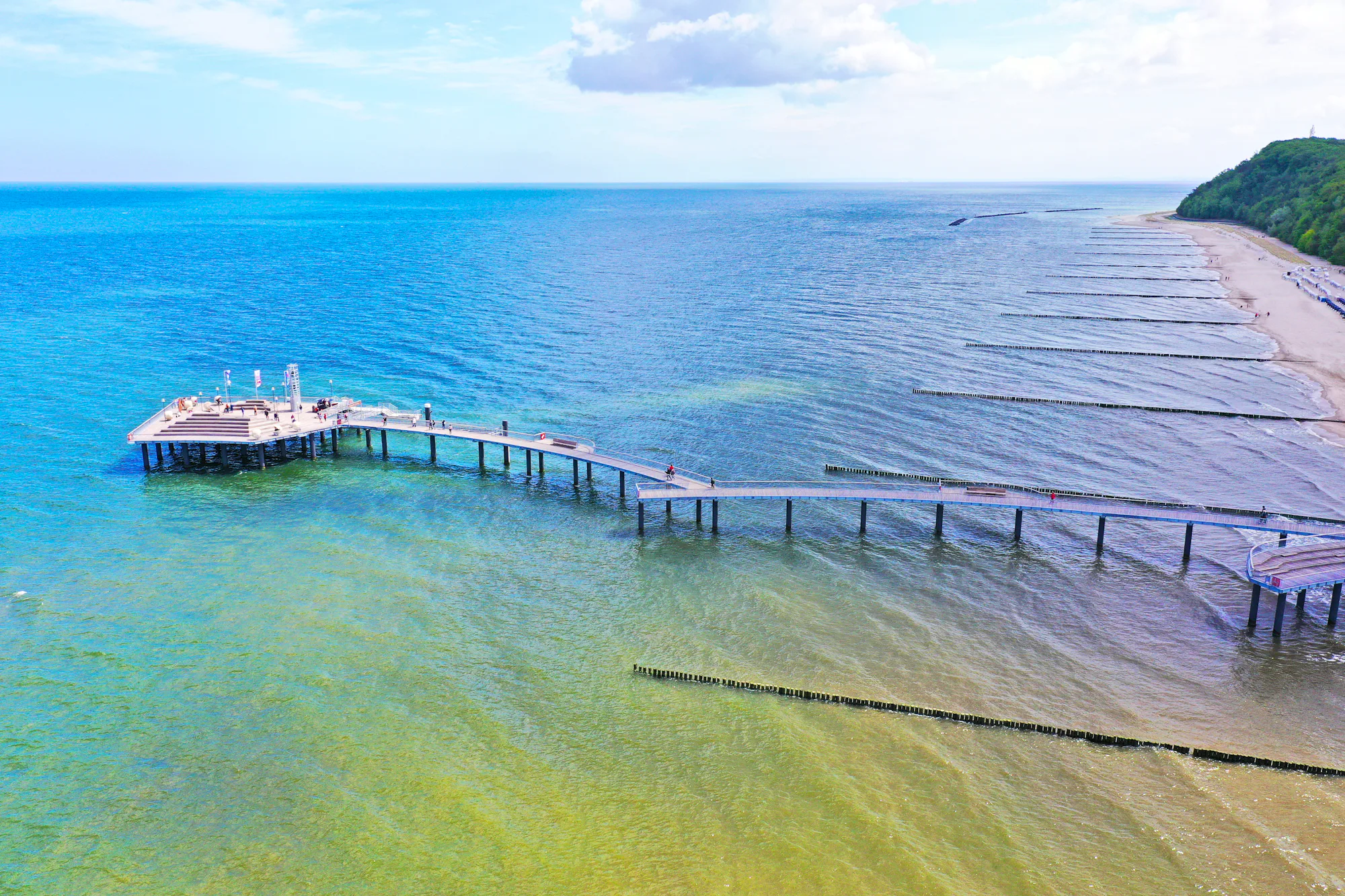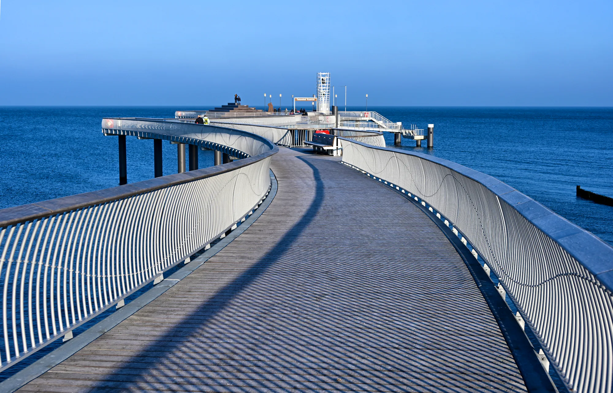 Auf dem Rückweg nach Zinnowitz legen Sie einen Stopp in Koserow ein. Die dortige Seebrücke wurde 2021 fertiggestellt und ist mit ihren 261 Metern und dem geschwungenen Holz-Stahl-Design eine der jüngeren Küstenanlagen der Region. Von ihr reicht der Blick weit über die Ostsee.