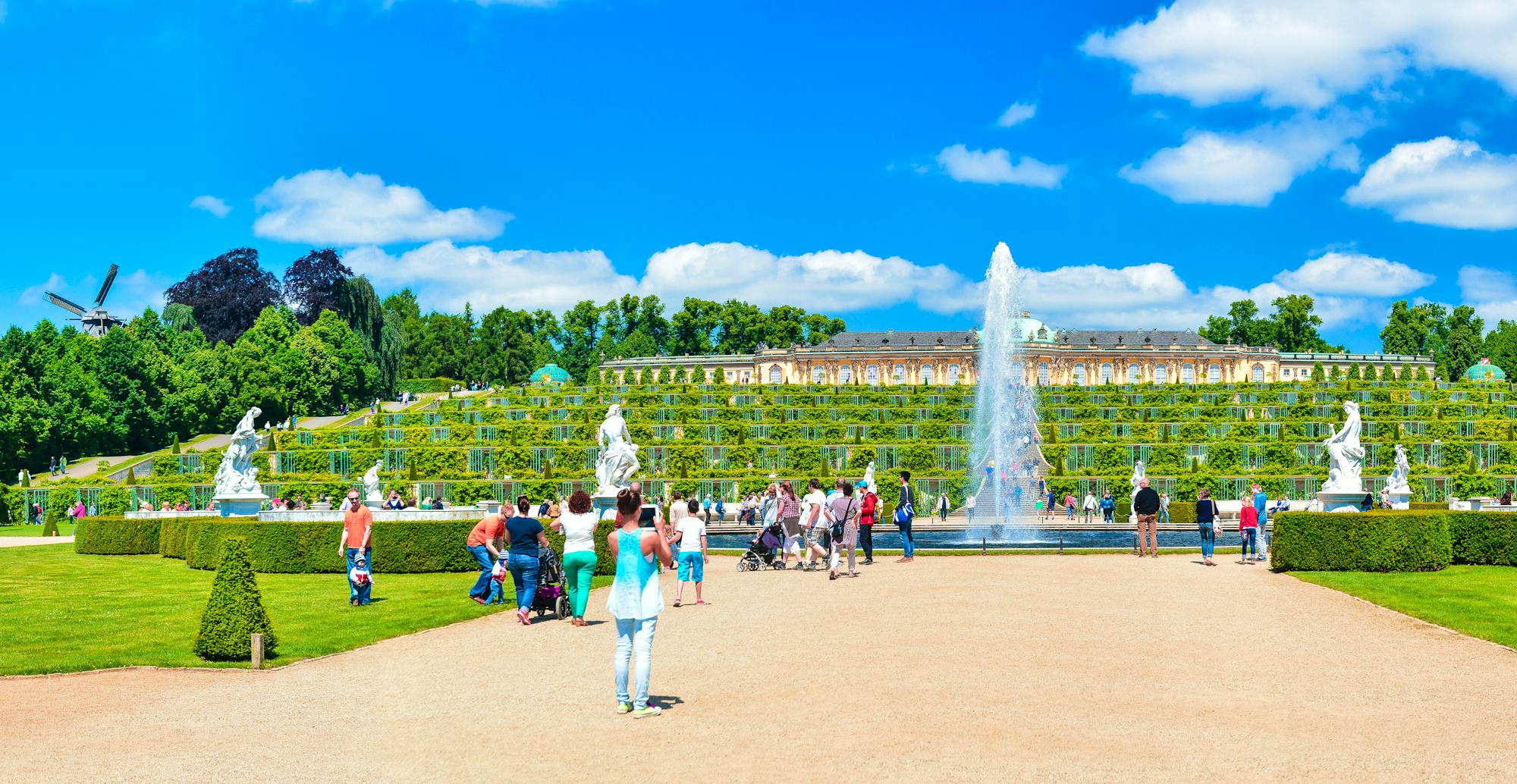 Fast schon majestätisch thront das Schloss auf seinen berühmten Weinbergterrassen am Ende einer langen, elegant geschwungenen Treppe. Nach Skizzen und Plänen Friedrichs des Großen wurde Sanssouci zum Hauptwerk deutscher Rokokoarchitektur. Im Inneren sind Werke von Watteau, Panini und Pesne ausgestellt und die von Pracht geprägten Räume sind original ausgestattet.