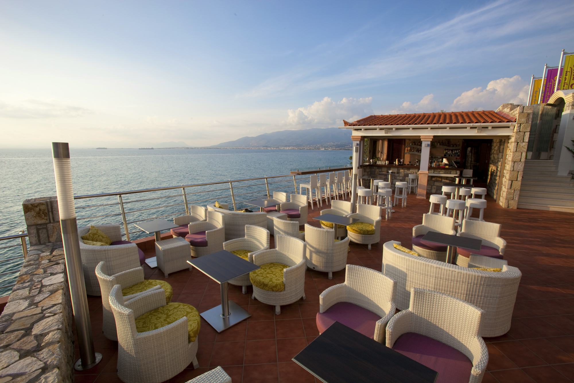 Das edle Alkyon Resort Hotel erstreckt sich auf 12 Gebäude, die in eine üppige 3000 m² große Grünanlage eingebettet wurden. Den schönen Sandstrand am Golf von Korinth erreicht man bereits nach 80 Metern.