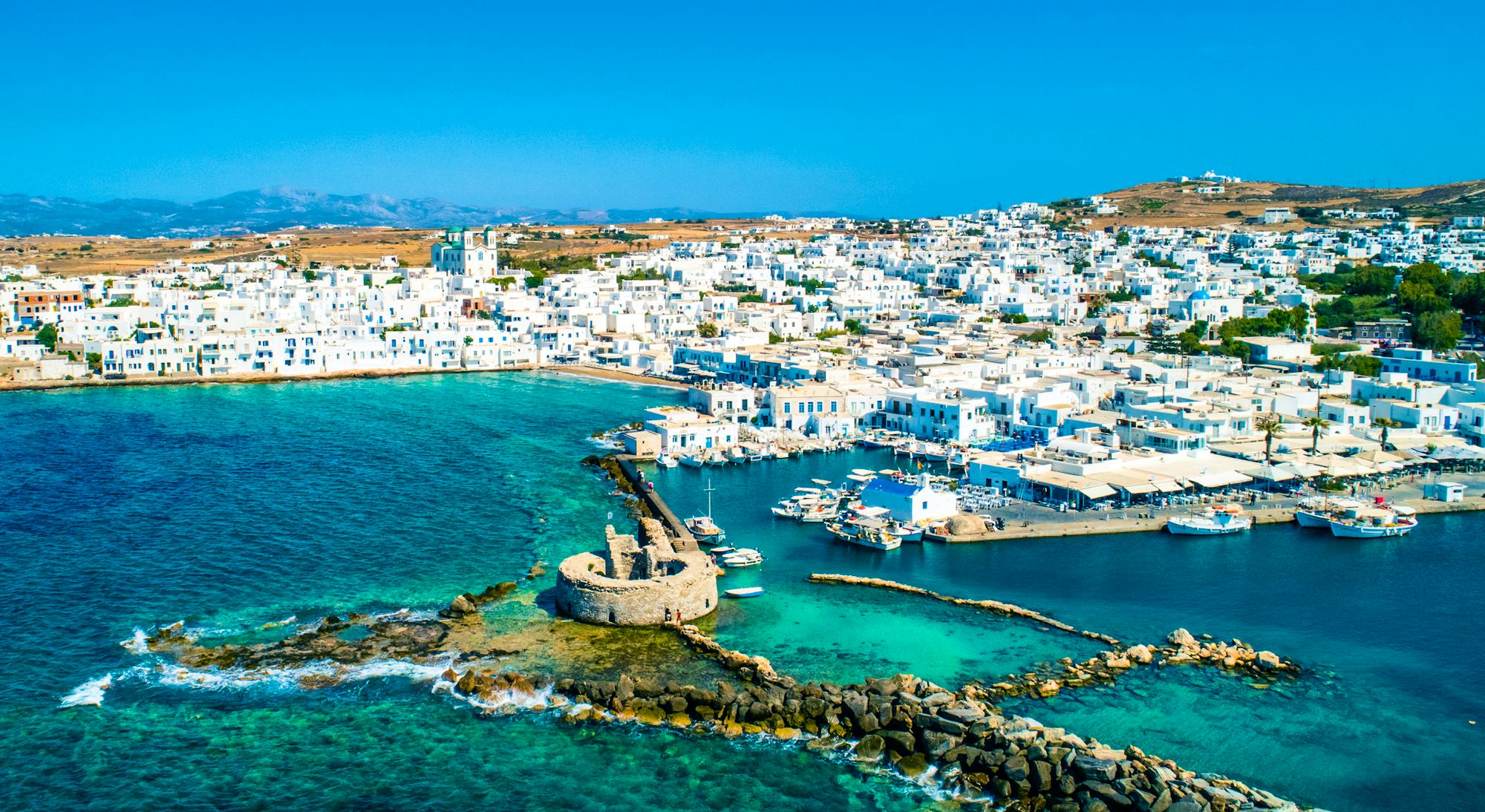 In Paros angekommen, spazieren Sie durch die Altstadt des Hauptortes Parikia, Sie sehen die Kirche Ekatontapiliani – eine der ältesten Kirchen Griechenlands. Danach haben Sie Freizeit in Parikia. Anschließend fahren Sie zu den antiken Steinbrüchen von Marathi, denen einige weltberühmte Kunstwerke ihre Entstehung zu verdanken haben. Fahrt durchs zentrale Bergmassiv zum Bergdorf Lefkes, wo Sie den hervorragenden Panoramablick genießen können. Danach fahren Sie in den Norden der Marmorinsel zum malerischen Fischerhafen Naoussa. Fährüberfahrt spät abends vom Hafen Paros nach Naxos