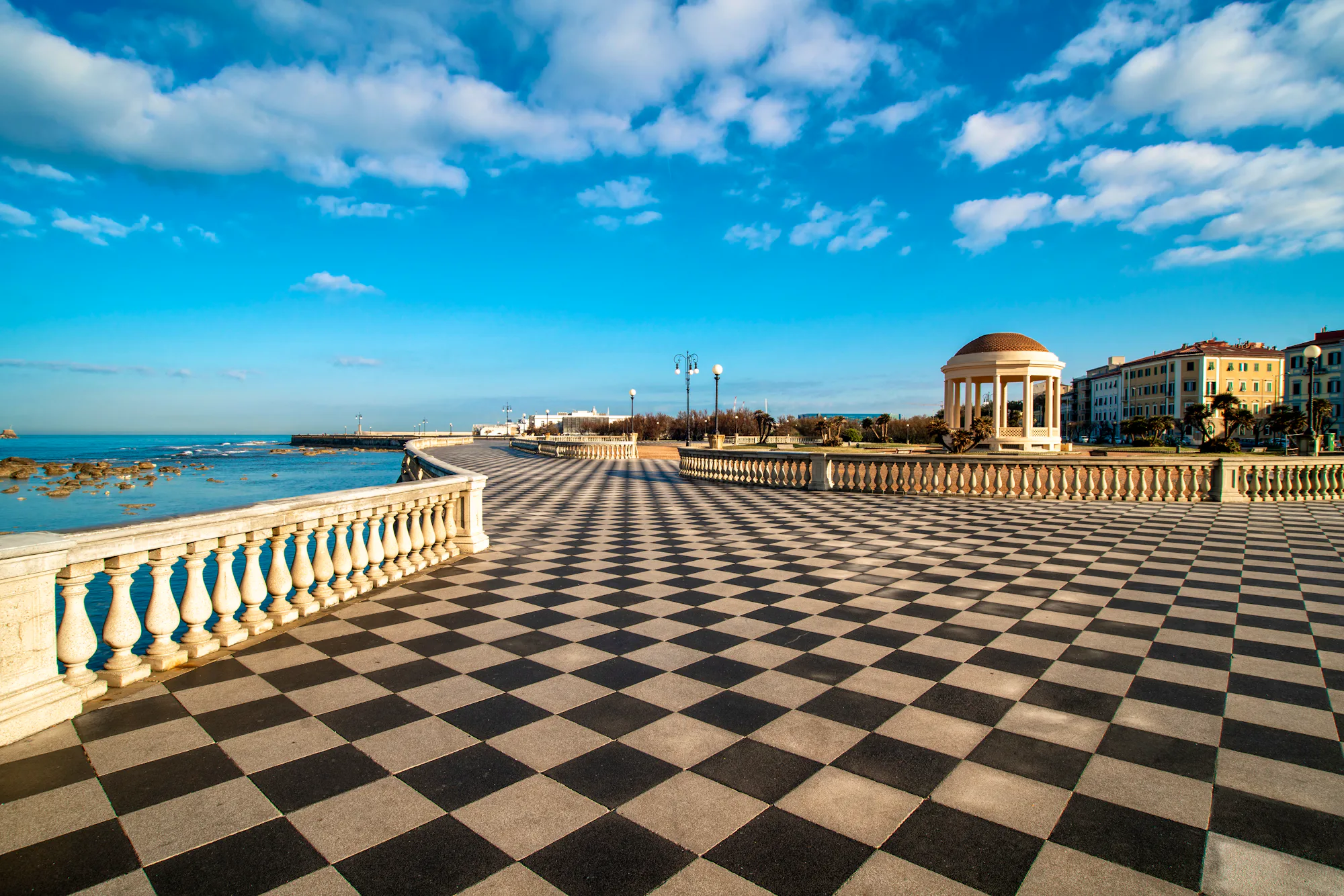 Am Vormittag besuchen Sie die lebhafte Hafenstadt Livorno weiter südlich an der toskanischen Küste, bekannt für ihre maritime Atmosphäre, historischen Kanäle und kulinarische Vielfalt. Die Stadt an der sogenannten etruskischen Küste ist geprägt von ihrem großen See- und Handelshafen, der seit Jahrhunderten ein Tor zu Mittelmeer und Fernhandel ist. Schon beim Ankommen spürt man das pulsierende Leben zwischen Schiffen, Fischmärkten und der geschäftigen Uferpromenade. Besonders charakteristisch ist das „Venezianische Viertel“ (Venezia Nuova) mit seinen malerischen Kanälen, Brücken und pastellfarbenen Häusern, das der Stadt einen romantischen, fast venezianischen Charme verleiht. Hier kann man gemütlich entlang der Kanäle spazieren und die lebendige Mischung aus Alltag, Cafés und kleinen Boutiquen beobachten. Livorno ist kulinarisch bekannt für seine frischen Fischmärkte und die toskanische Küche, darunter Spezialitäten wie Cacciucco, ein würziges Fischgericht, das die maritime Tradition der Stadt widerspiegelt. Hinzu kommt die moderne Seite mit weitläufigen Boulevards, Parks und einer lebendigen Promenade entlang der Küste, die zu Spaziergängen am Meer einlädt. Besonders spektakulär ist die Aussichtsterrasse Terrazza Mascagni aus den 1920er Jahren. Ihr Boden ist ein riesiges Schachbrettmuster aus über 34.000 schwarzen und weißen Fliesen auf rund 8700 Quadratmetern Fläche, das von einer geschwungenen Balustrade aus mehr als 4000 Säulen zum Meer hin begrenzt wird. Genießen Sie den herrlichen Ausblick!