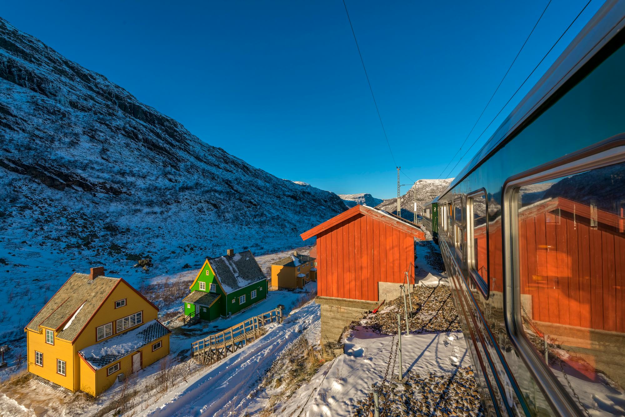 - Die Fahrt mit der Flambahn gilt als eine der weltweit schönsten Zugstrecken und ist im Winter umso beeindruckender, wenn sich die Bahn vom Fjord bis auf über 800 Meter ins Winterwunderland hinauf windet. Genießen Sie den Blick auf eine der wildesten Gebirgslandschaften Norwegens!