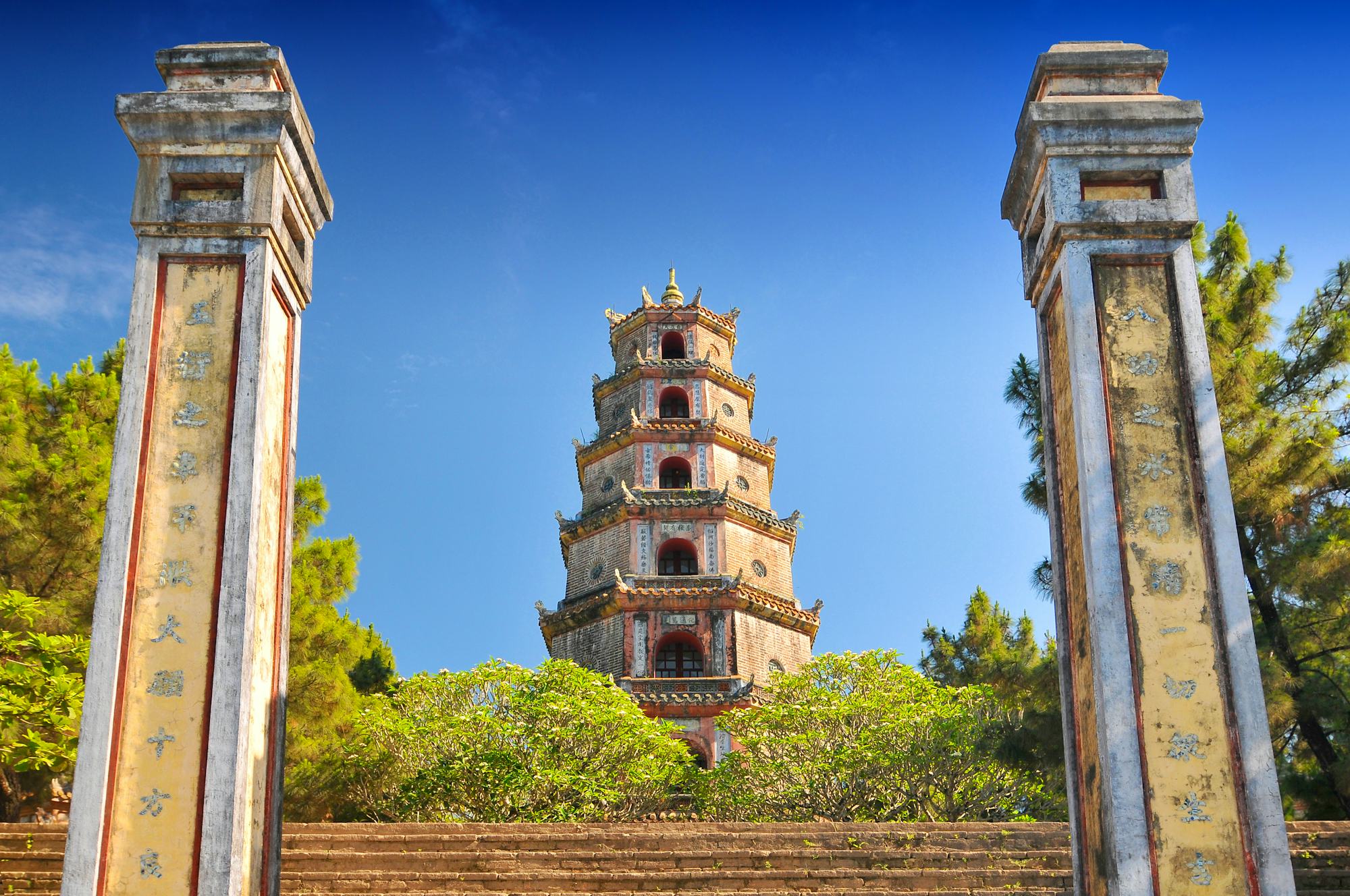Nach dem Frühstück begeben Sie sich auf eine stimmungsvolle Bootsfahrt auf dem Parfümfluss, der mit seinem ruhigen Lauf und den sanften Uferlandschaften zu den schönsten Wasserwegen Vietnams zählt. Entlang des Flusses besuchen Sie die berühmte Thien-Mu-Pagode, das spirituelle Wahrzeichen von Hue, sowie das prachtvolle Grabmal von Kaiser Tu Duc, eine der eindrucksvollsten kaiserlichen Grabanlagen Vietnams.