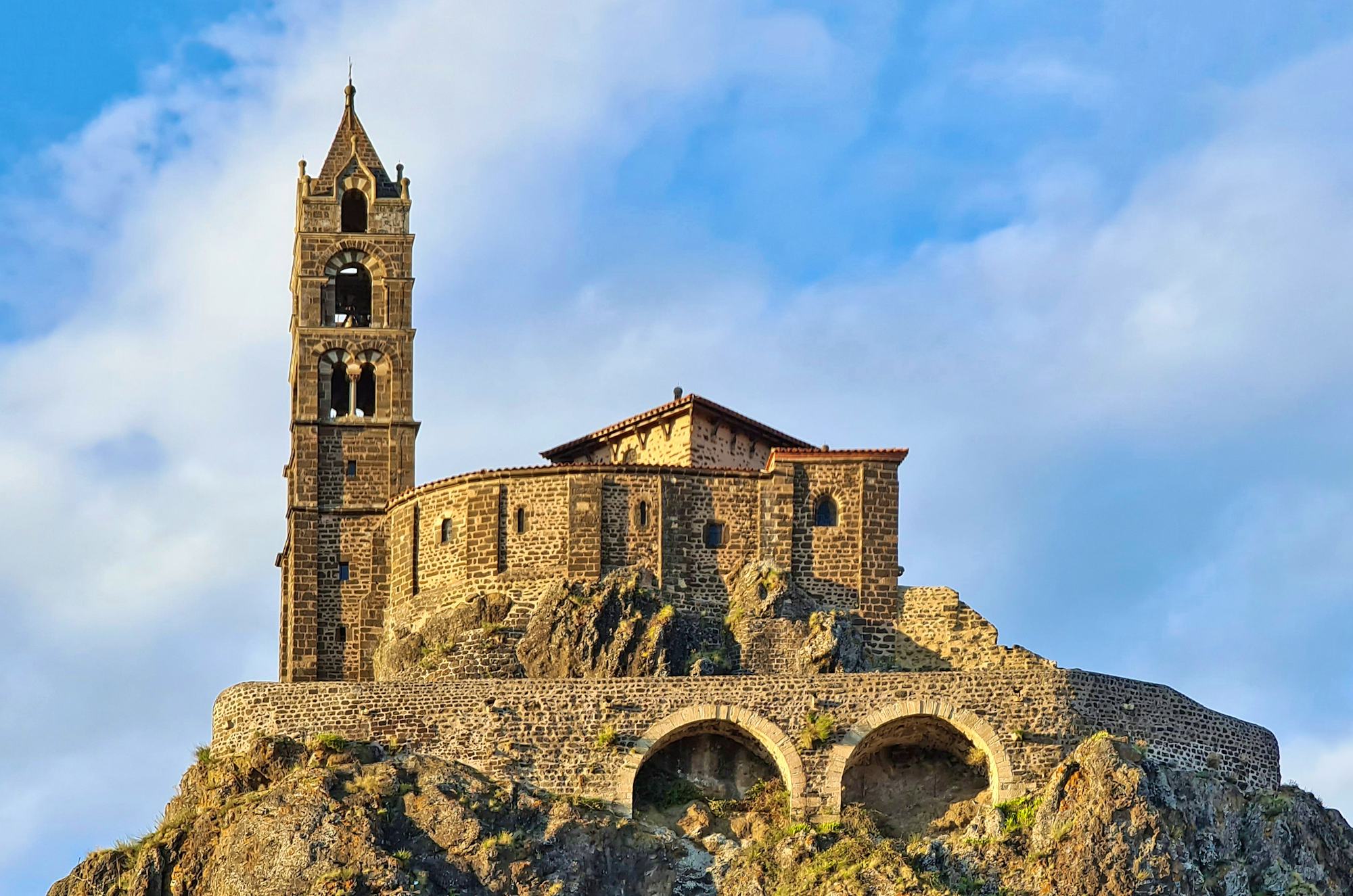 Der Ort Le Puy-en-Velay besticht durch seine eine ungewöhnliche Lage, denn aus seinem fruchtbaren Kessel ragen bizarre Gipfel empor, aus Schloten vulkanischen Ursprungs geformt. Hier gibt es ein UNESCO-Welterbe, das zum französischen Jakobsweg gehört: Die Kathedrale als Bischofssitz und einer der Punkte des Jakobsweges nach Santiago de Compostela, wurde aus verschiedenfarbigem Vulkangestein errichtet. Sie ist durch ihre prachtvolle Fassade ein architektonisches Meisterwerk und wegen der schwarzen Madonna ein berühmter Pilgerort in Frankreich. Drei der steil aufragendenden ehemaligen Vulkanschlote – hier Puys genannt – sind die Wahrzeichen der Stadt. Einer von Ihnen trägt die Kirche des „Heiligen Michael auf der Nadel“, der andere eine gewaltige Madonnenfigur. Von der riesigen Bronzestatue der Notre-Dame de France hat man einen weiten Blick über die Stadt.