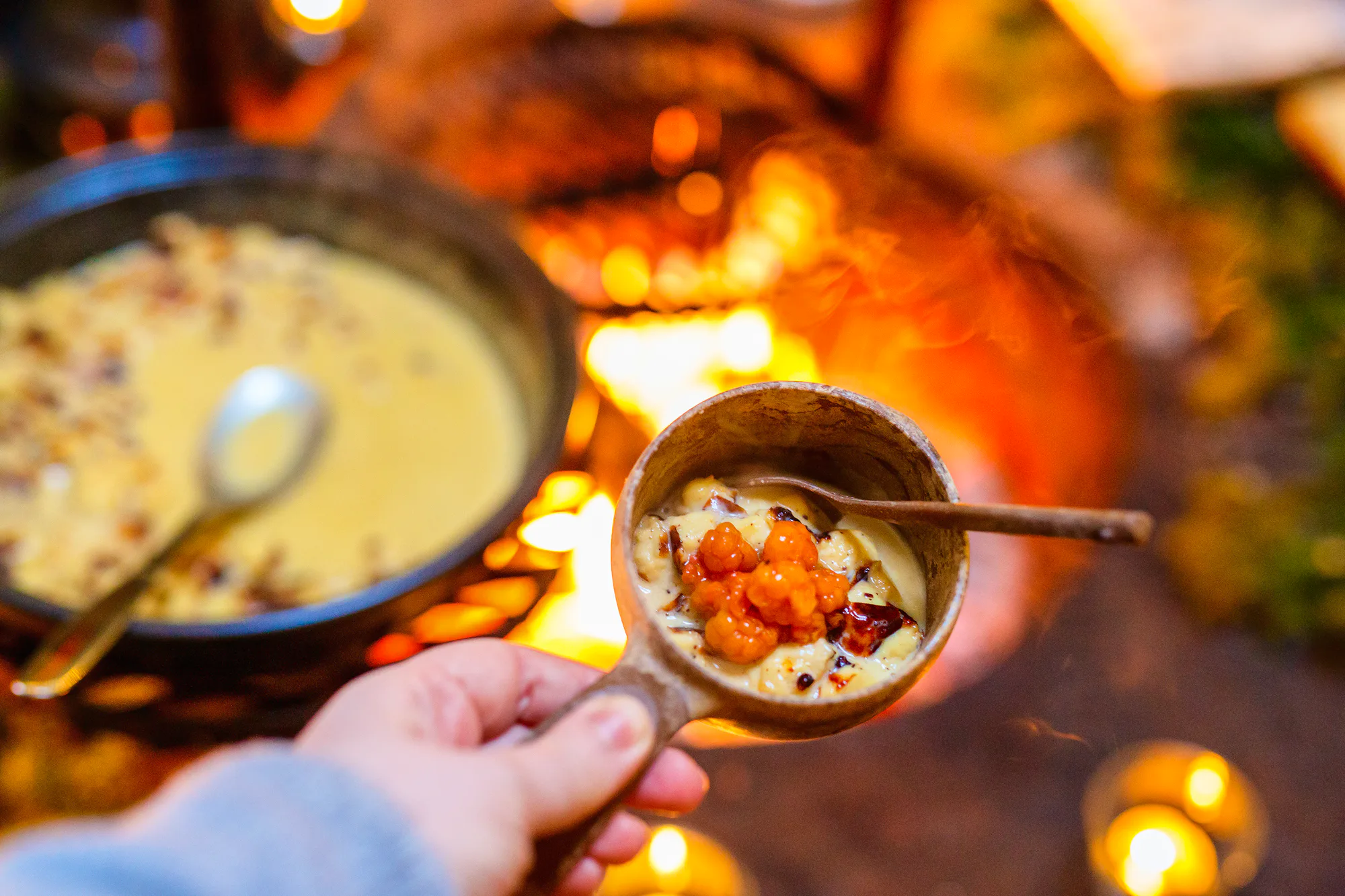 - Lassen Sie sich kulinarisch verwöhnen während eines Abendessens am knisternden Feuer in einer lappländischen Hütte oder im Saunahaus.