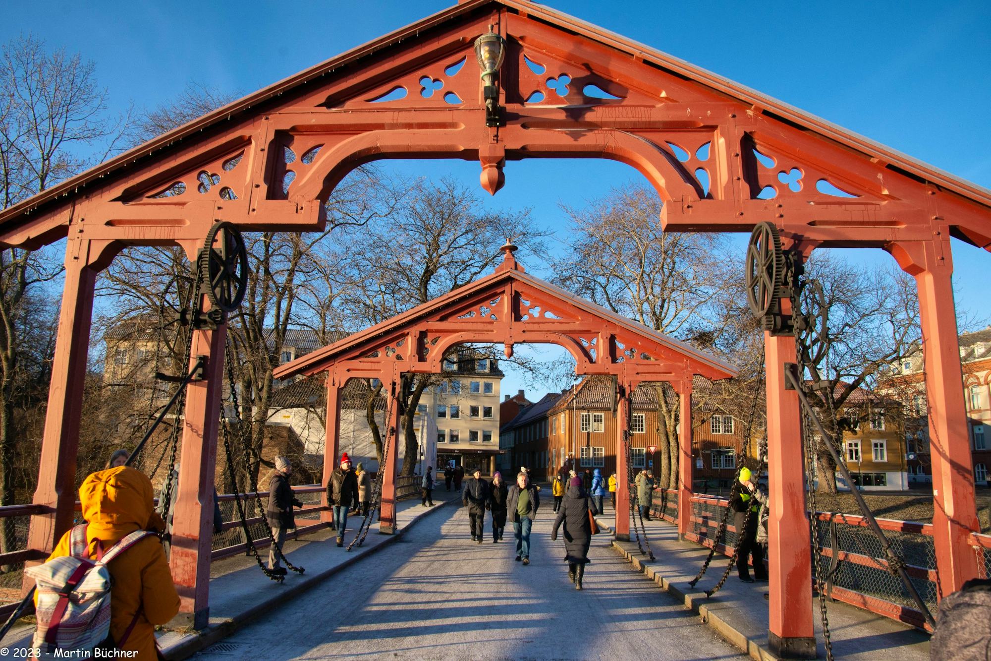 Spazieren Sie über die alte Brücke durch das entzückende Stadtviertel Bakklandet, das für seine malerischen Holzhäuser und gemütlichen Cafés bekannt ist, aber auch für seinen einzigartigen Fahrradlift – ein Beispiel für die innovative und umweltfreundliche Denkweise, die Norwegen auszeichnet.
