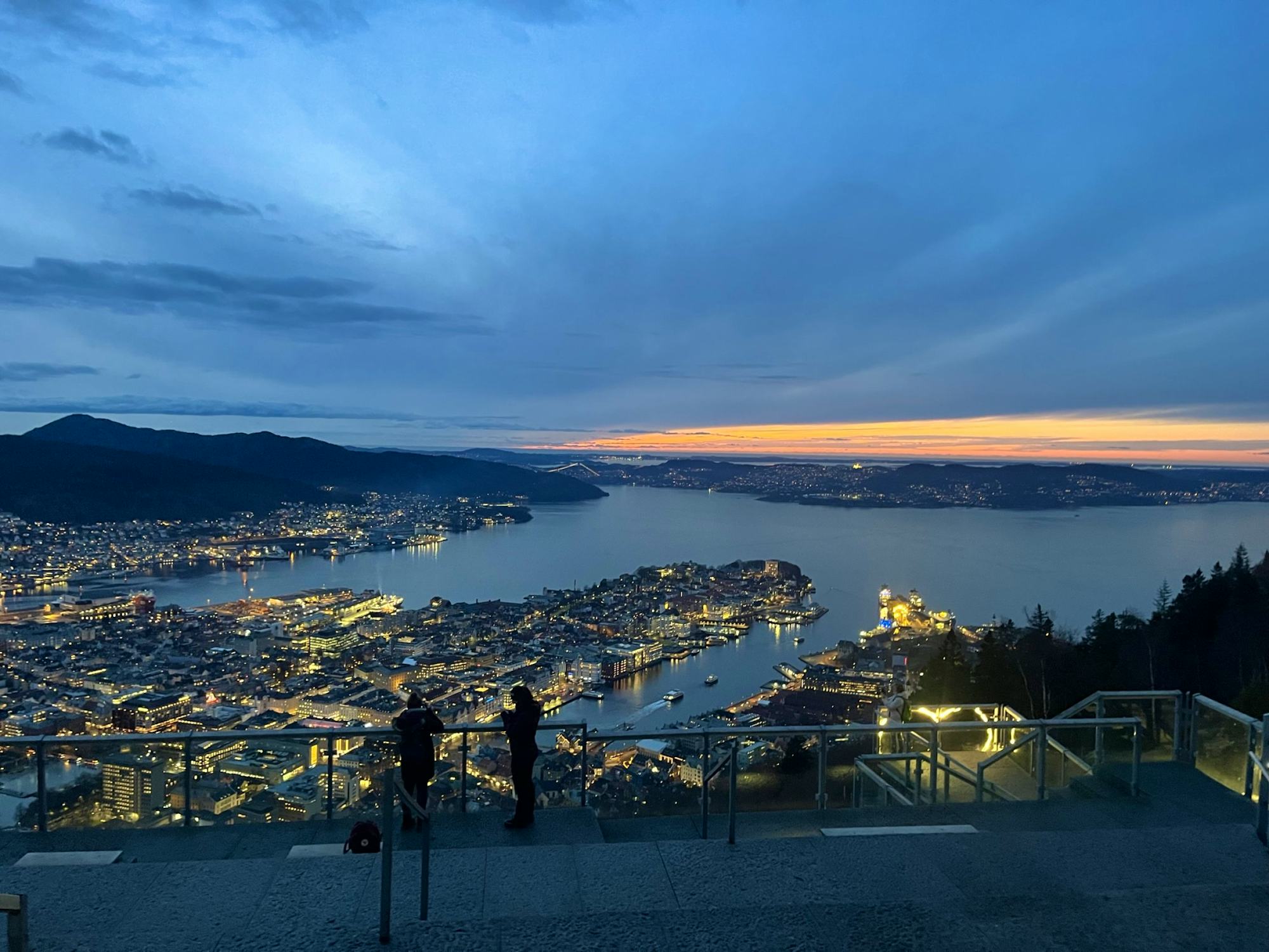 Nationaltheater, dem Treffpunkt Blauer Stein, dem Ole Bul Brunnen, dem gusseisernen Musikpavillion und dem Stadtweiher erreichen Sie das zum UNESCO Weltkulturerbe zählende Hansekonto Bryggen. Nach Ende des Stadtrundgangs besteht die fakultative Möglichkeit mit der Flöy-Bahn, einer Standseilbahn, auf einen der sieben Hausberge hinaufzufahren. Besonders empfehlenswert ist dies zum Sonnenuntergang, wenn die Lichter der Stadt gerade eingeschaltet werden. Genießen Sie einen fantastischen Blick aus 302 Metern Höhe auf die malerisch liegende Stadt umgeben von den sieben Hausbergen Bergens. Lassen Sie den Abend und die Reise in einem der unzähligen Restaurants und Bars bei einem individuellen Abendessen allein oder mit neuen Reisefreunden aus Ihrer Singlegruppe ausklingen.