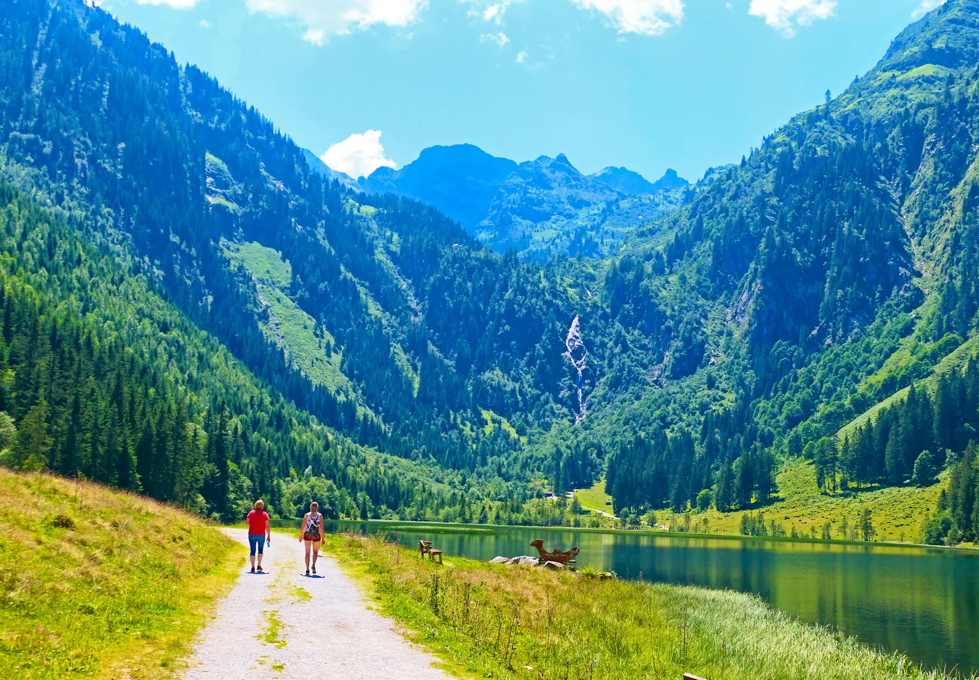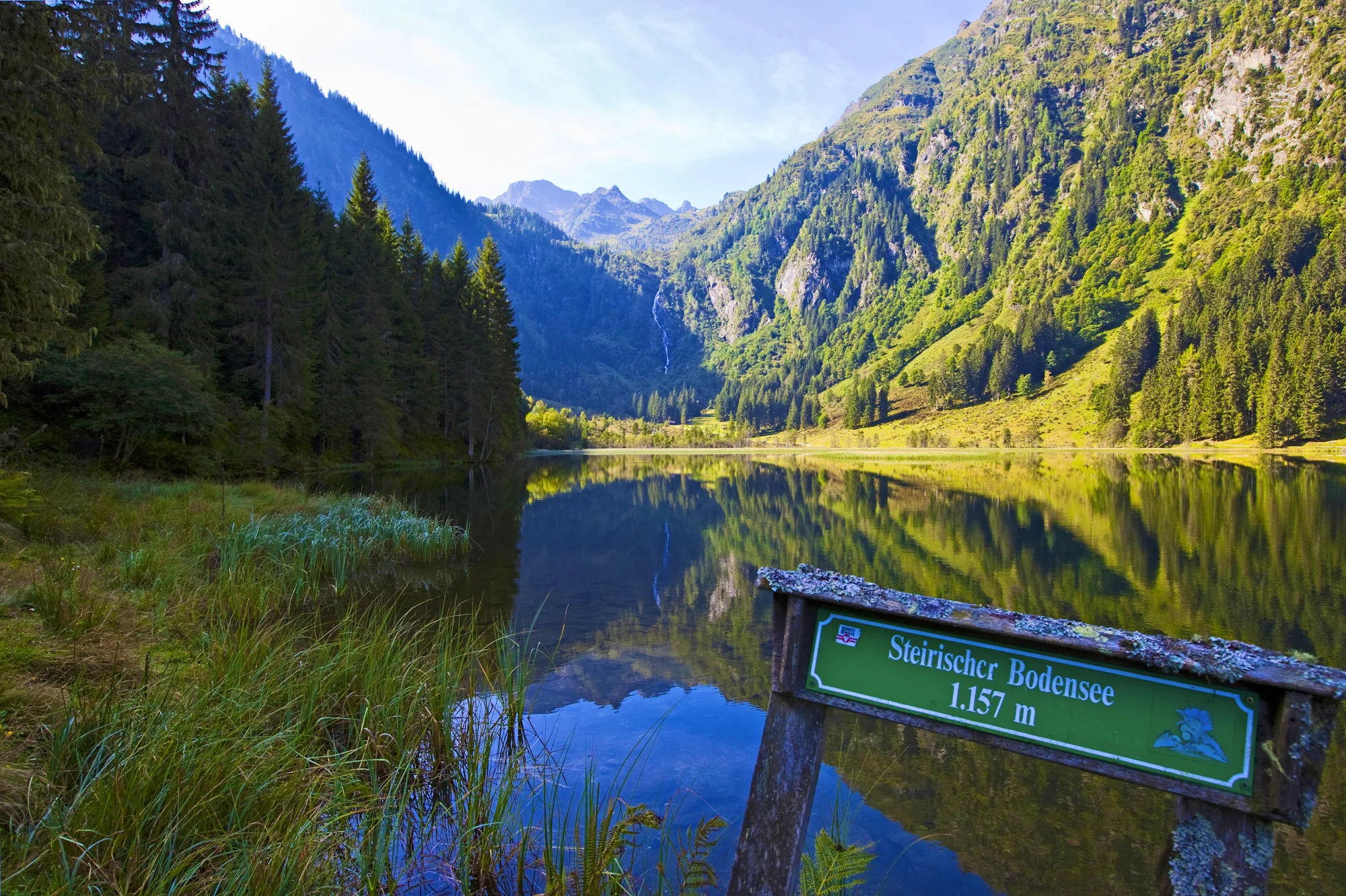 Entlang einer Almstraße starten Sie Ihre Wanderung zunächst zum Gasthof Forellenhof am Steirischen Bodensee. Sie folgen dem Westufer des fischreichen Sees bis zur Materialseilbahn. Hier steigen Sie stetig bergauf zum ersten Wasserfall. Weiter geht es auf den mühsam zu einer Treppe aufgeschichteten Steinplatten, mit zum Teil recht hohen Stufen, zur Hans-Wödl-Hütte (1.533 m) auf einer grünen Anhöhe. In der urigen Hütte können Sie sich stärken und den Blick über die Urgesteinsberge und den stillen Hüttensee genießen. Hinter der Hütte folgen Sie einem Weg, leicht abfallend und weiter am Westufer des Hüttensees entlang. Durch Büsche und Erlengestrüpp und später bergauf über eine grasbewachsene Geländestufe erreichen Sie den Obersee mit dem Schleierwasserfall. Gönnen Sie sich hier eine Pause, bevor es auf dem bereits bekannten Weg zum Ausgangspunkt zurückgeht.