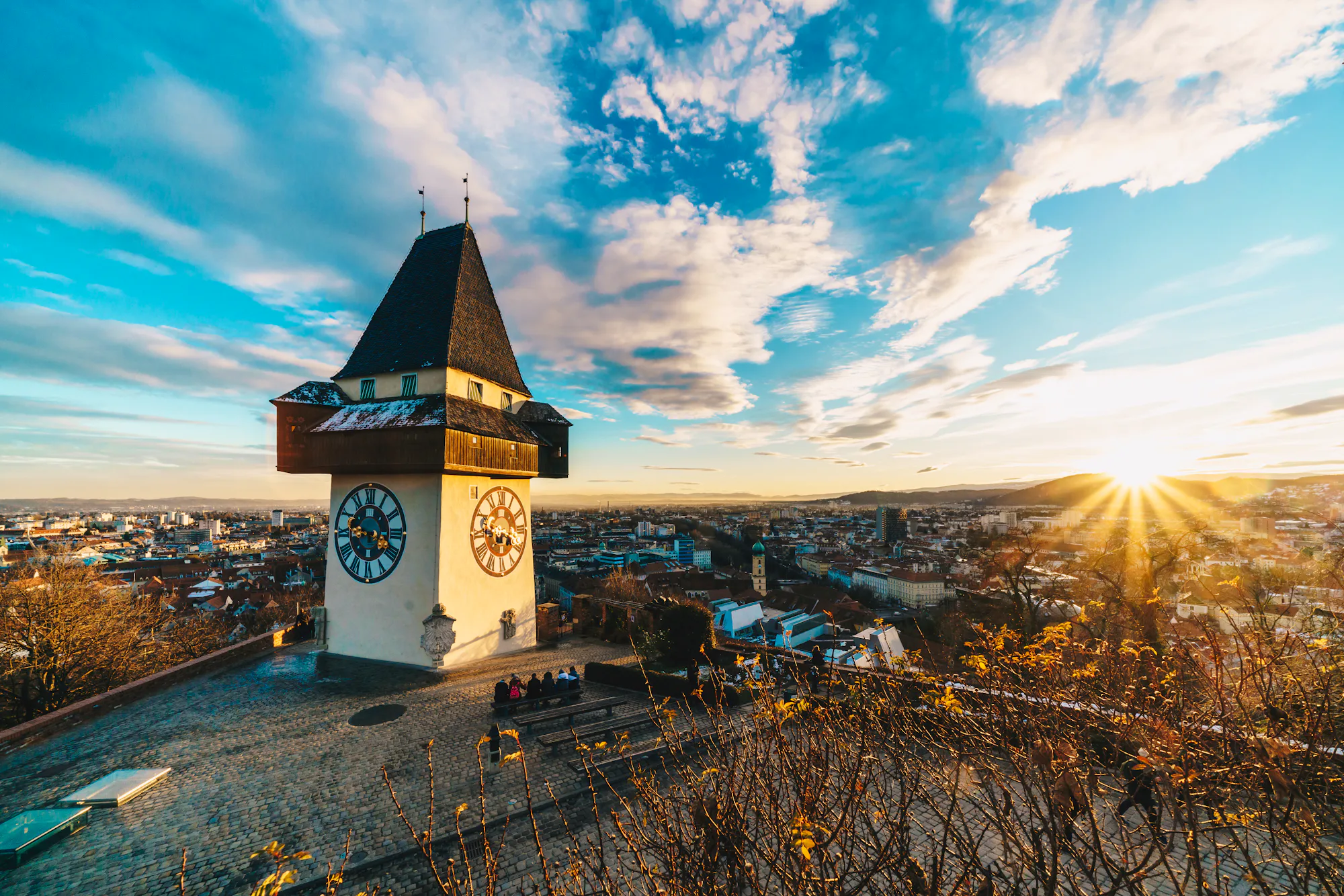 Nach der Führung geht es mit einem Fahrstuhl hoch hinauf auf den Schlossberg. Genießen Sie von hier einen aussichtsreichen Blick über die charmanten Dächer von Graz und bewundern Sie den Uhrturm, das Grazer Wahrzeichen. Es handelt sich um einen mittelalterlichen Turm, der bereits im 13. Jahrhundert erbaut wurde. Das Besondere an ihm ist jedoch, dass die Zeit hier eine andere Wertigkeit hat, Stunden zählen mehr als Minuten.